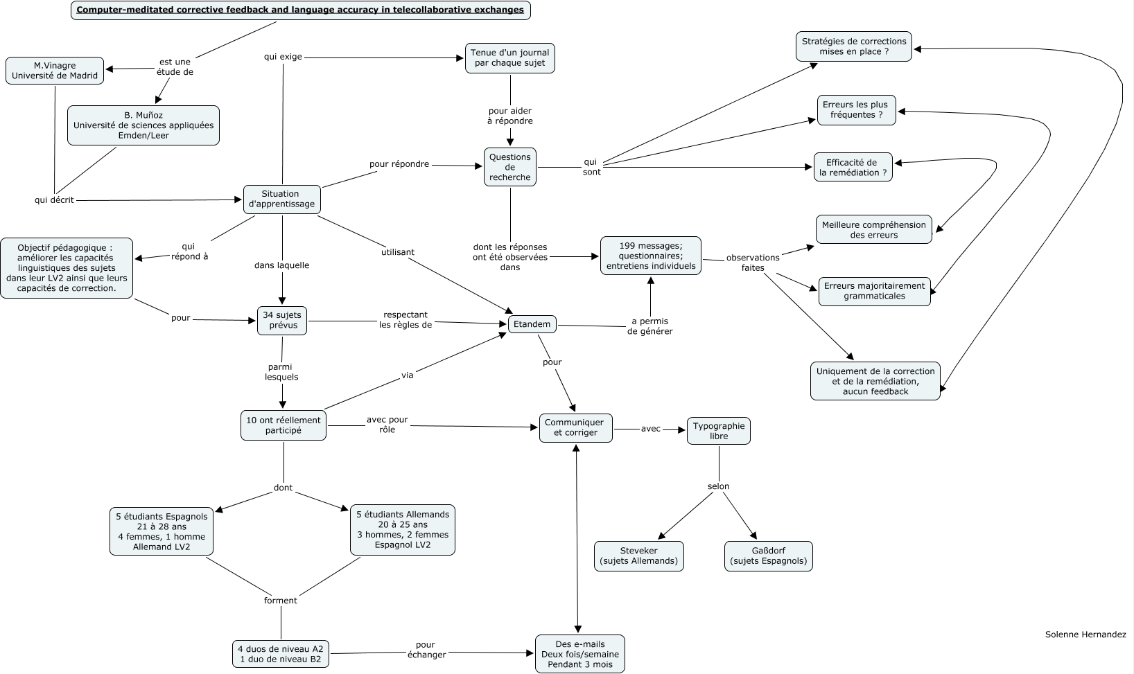Cette carte de concepts créée avec IHMC CmapTools traite de: Vinagre_Solenne_Hernandez, Situation d'apprentissage pour répondre Questions de recherche, 199 messages; questionnaires; entretiens individuels observations faites Uniquement de la correction et de la remédiation, aucun feedback, 10 ont réellement participé dont 5 étudiants Allemands 20 à 25 ans 3 hommes, 2 femmes Espagnol LV2, M.Vinagre Université de Madrid qui décrit Situation d'apprentissage, 199 messages; questionnaires; entretiens individuels observations faites Meilleure compréhension des erreurs, 34 sujets prévus respectant les règles de Etandem, Situation d'apprentissage qui exige Tenue d'un journal par chaque sujet, 10 ont réellement participé avec pour rôle Communiquer et corriger, Typographie libre selon Steveker (sujets Allemands), 5 étudiants Espagnols 21 à 28 ans 4 femmes, 1 homme Allemand LV2 forment 4 duos de niveau A2 1 duo de niveau B2, B. Muñoz Université de sciences appliquées Emden/Leer qui décrit Situation d'apprentissage, 199 messages; questionnaires; entretiens individuels observations faites Erreurs majoritairement grammaticales, 10 ont réellement participé via Etandem, Situation d'apprentissage qui répond à Objectif pédagogique : améliorer les capacités linguistiques des sujets dans leur LV2 ainsi que leurs capacités de correction., Computer-meditated corrective feedback and language accuracy in telecollaborative exchanges est une étude de M.Vinagre Université de Madrid, Questions de recherche qui sont Stratégies de corrections mises en place ?, Questions de recherche dont les réponses ont été observées dans 199 messages; questionnaires; entretiens individuels, Situation d'apprentissage utilisant Etandem, Typographie libre selon Gaßdorf (sujets Espagnols), Etandem pour Communiquer et corriger