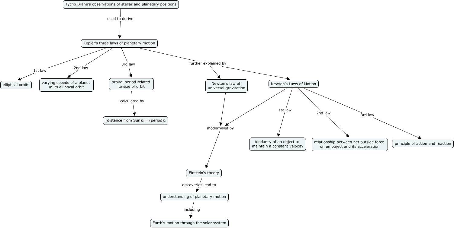 This Concept Map, created with IHMC CmapTools, has information related to: Motion of Earth and other planets (Simon), Tycho Brahe's observations of stellar and planetary positions used to derive Kepler's three laws of planetary motion, Kepler's three laws of planetary motion 3rd law orbital period related to size of orbit, Newton's Laws of Motion 2nd law relationship between net outside force on an object and its acceleration, Kepler's three laws of planetary motion 1st law elliptical orbits, understanding of planetary motion including Earth's motion through the solar system, Kepler's three laws of planetary motion 2nd law varying speeds of a planet in its elliptical orbit, Kepler's three laws of planetary motion further explained by Newton's Laws of Motion, Newton's Laws of Motion 3rd law principle of action and reaction, Kepler's three laws of planetary motion further explained by Newton's law of universal gravitation, Newton's law of universal gravitation modernised by Einstein's theory, Newton's Laws of Motion modernised by Einstein's theory, orbital period related to size of orbit calculated by (distance from Sun)3 = (period)2, Newton's Laws of Motion 1st law tendancy of an object to maintain a constant velocity, Einstein's theory discoveries lead to understanding of planetary motion