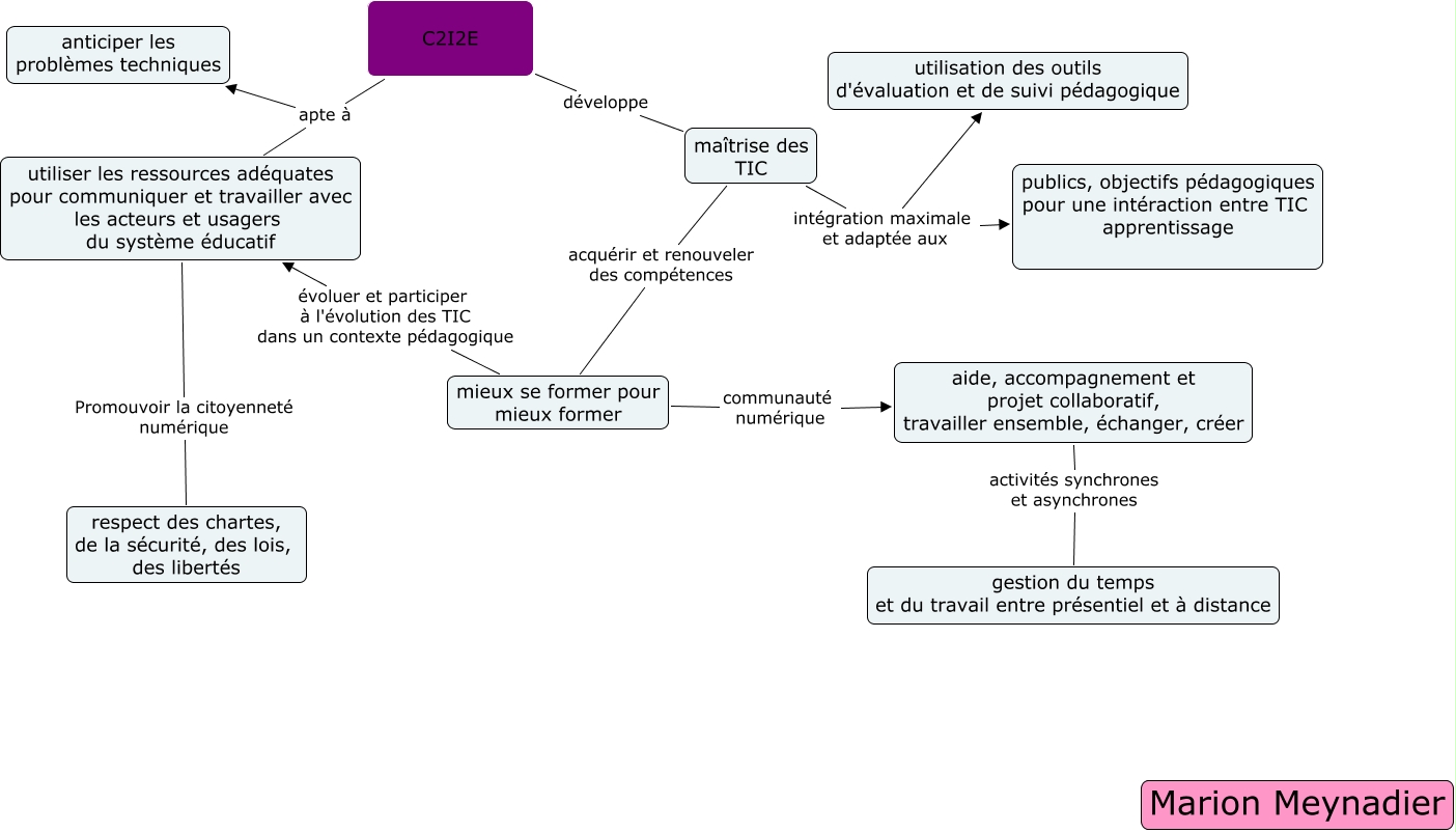 Cette carte de concepts créée avec IHMC CmapTools traite de: C2I2E_meynadier, C2I2E développe maîtrise des TIC, mieux se former pour mieux former communauté numérique aide, accompagnement et projet collaboratif, travailler ensemble, échanger, créer, C2I2E apte à anticiper les problèmes techniques, maîtrise des TIC intégration maximale et adaptée aux publics, objectifs pédagogiques pour une intéraction entre TIC apprentissage, aide, accompagnement et projet collaboratif, travailler ensemble, échanger, créer activités synchrones et asynchrones gestion du temps et du travail entre présentiel et à distance, maîtrise des TIC intégration maximale et adaptée aux utilisation des outils d'évaluation et de suivi pédagogique, maîtrise des TIC acquérir et renouveler des compétences mieux se former pour mieux former, utiliser les ressources adéquates pour communiquer et travailler avec les acteurs et usagers du système éducatif Promouvoir la citoyenneté numérique respect des chartes, de la sécurité, des lois, des libertés, mieux se former pour mieux former évoluer et participer à l'évolution des TIC dans un contexte pédagogique utiliser les ressources adéquates pour communiquer et travailler avec les acteurs et usagers du système éducatif, C2I2E apte à utiliser les ressources adéquates pour communiquer et travailler avec les acteurs et usagers du système éducatif