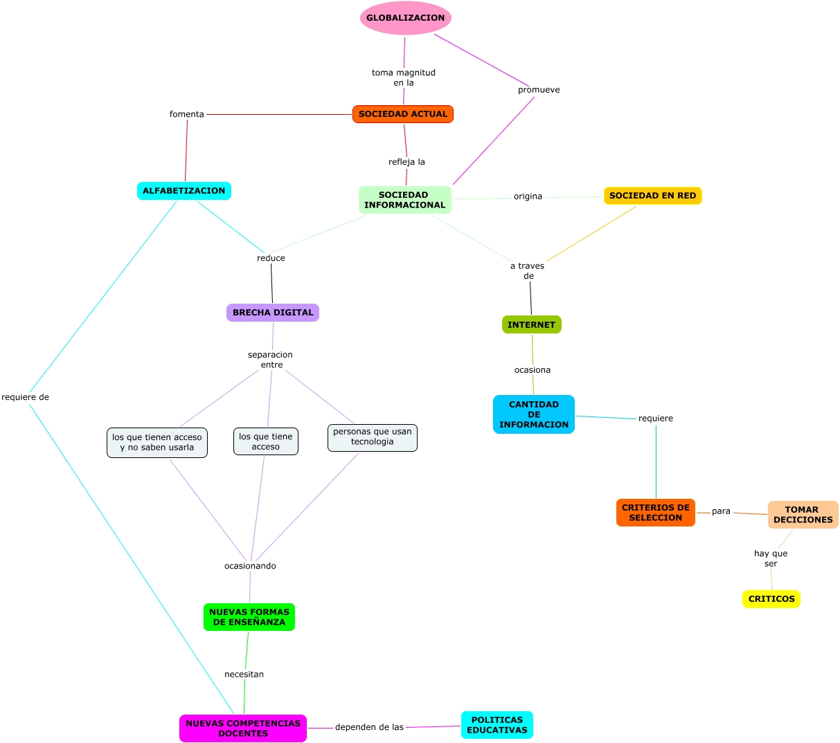 Este Cmap, tiene información relacionada con: mapa nuevas tecnologias-evelyn-natali-, SOCIEDAD EN RED a traves de INTERNET, SOCIEDAD INFORMACIONAL a traves de INTERNET, ALFABETIZACION reduce BRECHA DIGITAL, BRECHA DIGITAL separacion entre los que tiene acceso, CANTIDAD DE INFORMACION requiere CRITERIOS DE SELECCION, SOCIEDAD ACTUAL refleja la SOCIEDAD INFORMACIONAL, NUEVAS FORMAS DE ENSEÑANZA necesitan NUEVAS COMPETENCIAS DOCENTES, BRECHA DIGITAL separacion entre los que tienen acceso y no saben usarla, NUEVAS COMPETENCIAS DOCENTES dependen de las POLITICAS EDUCATIVAS, GLOBALIZACION promueve SOCIEDAD INFORMACIONAL, GLOBALIZACION toma magnitud en la SOCIEDAD ACTUAL, SOCIEDAD ACTUAL fomenta ALFABETIZACION, los que tiene acceso ocasionando NUEVAS FORMAS DE ENSEÑANZA, SOCIEDAD INFORMACIONAL reduce BRECHA DIGITAL, INTERNET ocasiona CANTIDAD DE INFORMACION, los que tienen acceso y no saben usarla ocasionando NUEVAS FORMAS DE ENSEÑANZA, ALFABETIZACION requiere de NUEVAS COMPETENCIAS DOCENTES, SOCIEDAD INFORMACIONAL origina SOCIEDAD EN RED, personas que usan tecnologia ocasionando NUEVAS FORMAS DE ENSEÑANZA, BRECHA DIGITAL separacion entre personas que usan tecnologia