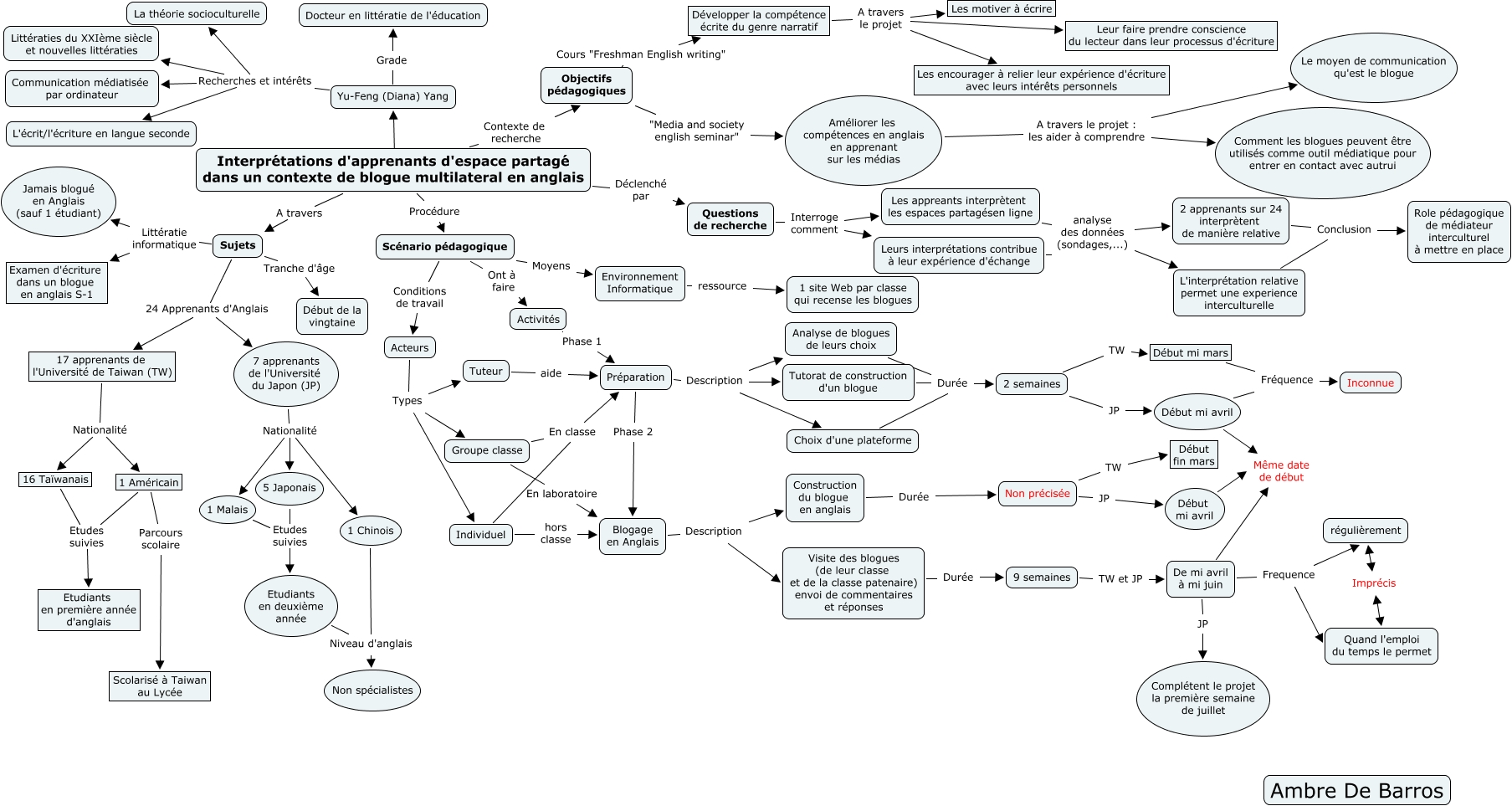 Cette carte de concepts créée avec IHMC CmapTools traite de: yang-debarros, 17 apprenants de l'Université de Taiwan (TW) Nationalité 16 Taïwanais, De mi avril à mi juin JP Complétent le projet la première semaine de juillet, Groupe classe En classe Préparation, Choix d'une plateforme Durée 2 semaines, Préparation Description Choix d'une plateforme, 5 Japonais Etudes suivies Etudiants en deuxième année, Scénario pédagogique Moyens Environnement Informatique, Leurs interprétations contribue à leur expérience d'échange analyse des données (sondages,...) L'interprétation relative permet une experience interculturelle, Yu-Feng (Diana) Yang Grade Docteur en littératie de l'éducation, 2 semaines JP Début mi avril, 7 apprenants de l'Université du Japon (JP) Nationalité 5 Japonais, Analyse de blogues de leurs choix Durée 2 semaines, Améliorer les compétences en anglais en apprenant sur les médias A travers le projet : les aider à comprendre Le moyen de communication qu'est le blogue, Les appreants interprètent les espaces partagésen ligne analyse des données (sondages,...) L'interprétation relative permet une experience interculturelle, Début mi avril Fréquence Inconnue, Développer la compétence écrite du genre narratif A travers le projet Les encourager à relier leur expérience d'écriture avec leurs intérêts personnels, Individuel hors classe Blogage en Anglais, 9 semaines TW et JP De mi avril à mi juin, Individuel En classe Préparation, Sujets Littératie informatique Examen d'écriture dans un blogue en anglais S-1