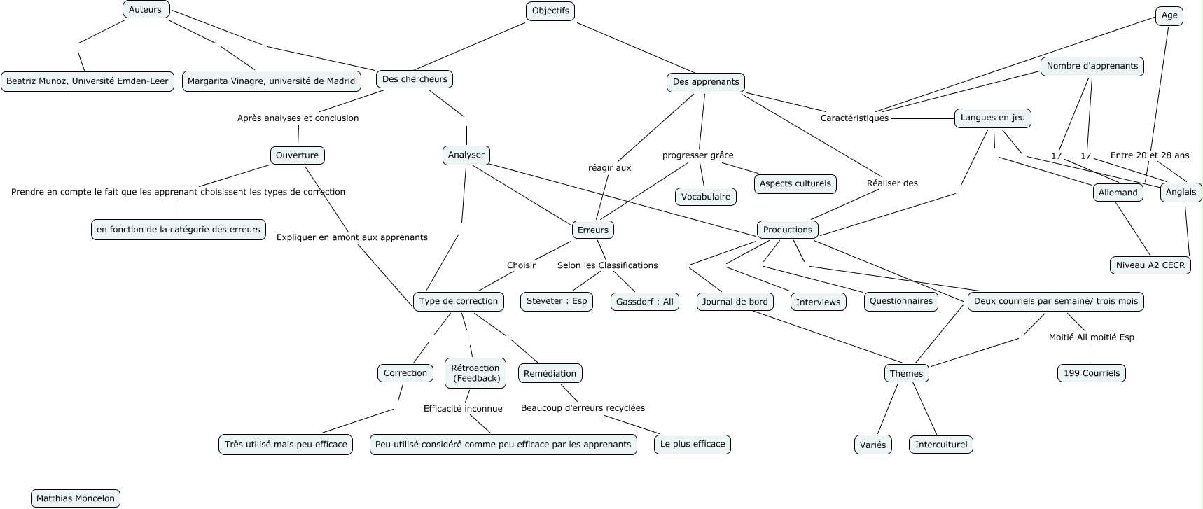 Cette carte de concepts créée avec IHMC CmapTools traite de: Vinagre_Matthias_Moncelon, Nombre d'apprenants 17 Allemand, Des chercheurs Auteurs, Langues en jeu Productions, Rétroaction (Feedback) Efficacité inconnue Peu utilisé considéré comme peu efficace par les apprenants, Productions Interviews, Des chercheurs Analyser, Age Entre 20 et 28 ans Anglais, Des apprenants Caractéristiques Langues en jeu, Productions Questionnaires, Objectifs ???? Des chercheurs, Anglais Niveau A2 CECR, Deux courriels par semaine/ trois mois Thèmes, Analyser Type de correction, Auteurs Margarita Vinagre, université de Madrid, Objectifs Des apprenants, Erreurs Selon les Classifications Gassdorf : All, Ouverture Prendre en compte le fait que les apprenant choisissent les types de correction en fonction de la catégorie des erreurs, Productions Deux courriels par semaine/ trois mois, Deux courriels par semaine/ trois mois Moitié All moitié Esp 199 Courriels, Des apprenants réagir aux Erreurs