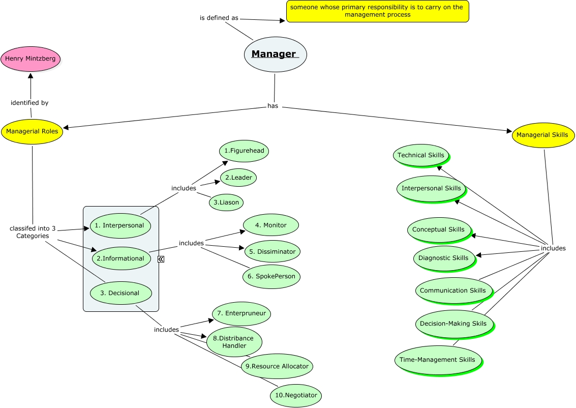This Concept Map, created with IHMC CmapTools, has information related to: Managerial Roles and Skills, Managerial Skills includes Time-Management Skills, 3. Decisional includes 10.Negotiator, Managerial Roles classifed into 3 Categories 2.Informational, Managerial Skills includes Decision-Making Skils, Managerial Roles identified by Henry Mintzberg, 1. Interpersonal includes 2.Leader, 2.Informational includes 5. Dissiminator, 3. Decisional includes 8.Distribance Handler, Managerial Roles classifed into 3 Categories 1. Interpersonal, Managerial Skills includes Diagnostic Skills, 3. Decisional includes 7. Enterpruneur, Manager is defined as someone whose primary responsibility is to carry on the management process, Managerial Skills includes Interpersonal Skills, 2.Informational includes 4. Monitor, 2.Informational includes 6. SpokePerson, 1. Interpersonal includes 3.Liason, 3. Decisional includes 9.Resource Allocator, Managerial Roles classifed into 3 Categories 3. Decisional, Manager has Managerial Skills, Managerial Skills includes Conceptual Skills