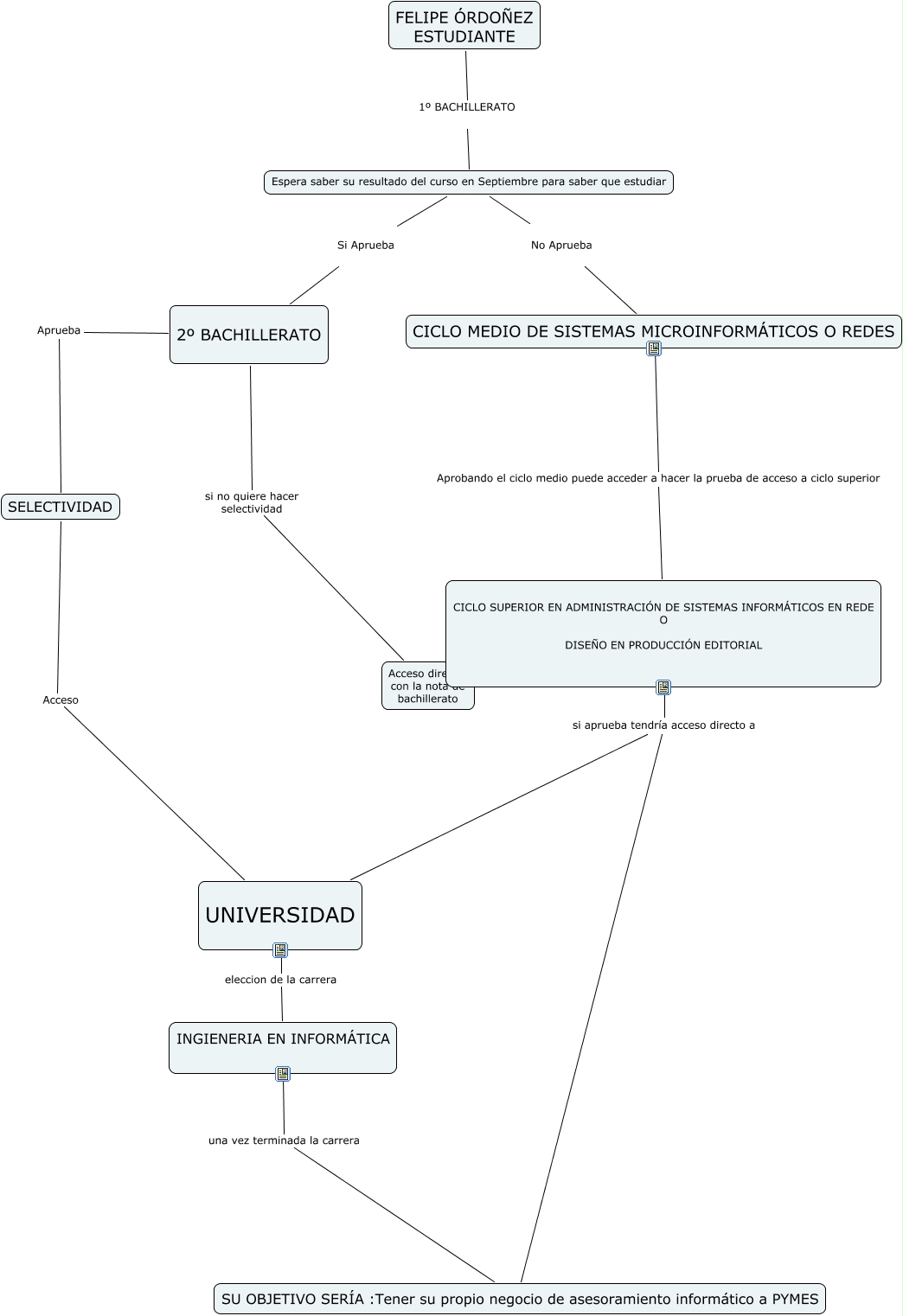 Este Cmap, tiene información relacionada con: Cristinabarcala, CICLO SUPERIOR EN ADMINISTRACIÓN DE SISTEMAS INFORMÁTICOS EN REDE O DISEÑO EN PRODUCCIÓN EDITORIAL si aprueba tendría acceso directo a UNIVERSIDAD, CICLO SUPERIOR EN ADMINISTRACIÓN DE SISTEMAS INFORMÁTICOS EN REDE O DISEÑO EN PRODUCCIÓN EDITORIAL si aprueba tendría acceso directo a SU OBJETIVO SERÍA :Tener su propio negocio de asesoramiento informático a PYMES, FELIPE ÓRDOÑEZ ESTUDIANTE 1º BACHILLERATO Espera saber su resultado del curso en Septiembre para saber que estudiar, Espera saber su resultado del curso en Septiembre para saber que estudiar Si Aprueba 2º BACHILLERATO, INGIENERIA EN INFORMÁTICA una vez terminada la carrera SU OBJETIVO SERÍA :Tener su propio negocio de asesoramiento informático a PYMES, 2º BACHILLERATO si no quiere hacer selectividad Acceso directo con la nota de bachillerato, CICLO MEDIO DE SISTEMAS MICROINFORMÁTICOS O REDES Aprobando el ciclo medio puede acceder a hacer la prueba de acceso a ciclo superior CICLO SUPERIOR EN ADMINISTRACIÓN DE SISTEMAS INFORMÁTICOS EN REDE O DISEÑO EN PRODUCCIÓN EDITORIAL, SELECTIVIDAD Acceso UNIVERSIDAD, 2º BACHILLERATO Aprueba SELECTIVIDAD, UNIVERSIDAD eleccion de la carrera INGIENERIA EN INFORMÁTICA, Espera saber su resultado del curso en Septiembre para saber que estudiar No Aprueba CICLO MEDIO DE SISTEMAS MICROINFORMÁTICOS O REDES