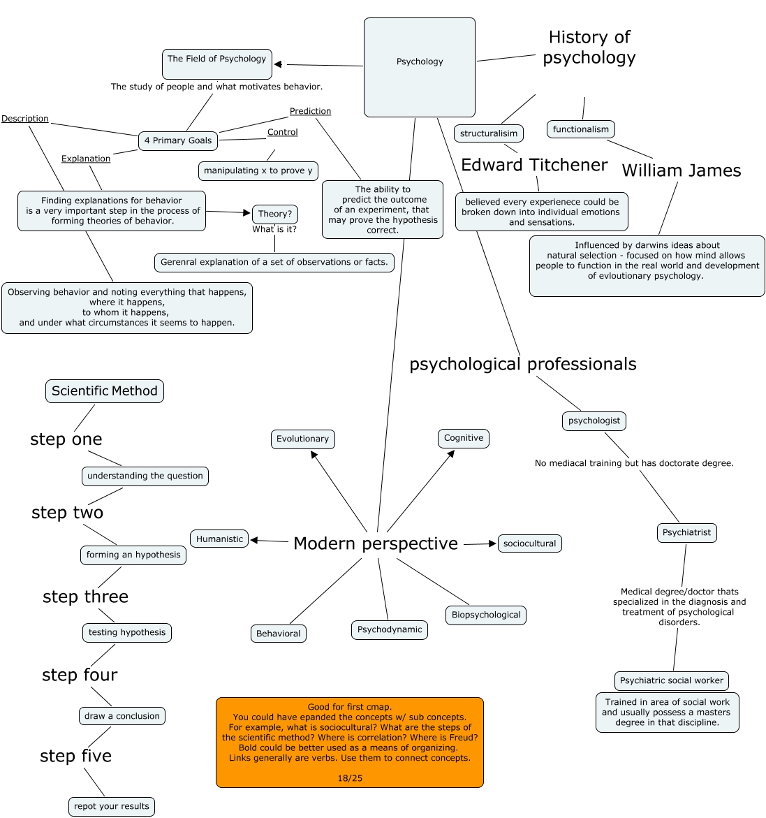 This Concept Map, created with IHMC CmapTools, has information related to: first test Beau Day ch 1, Psychology Modern perspective Psychodynamic, Psychology psychological professionals psychologist, Psychology Modern perspective Evolutionary, Finding explanations for behavior is a very important step in the process of forming theories of behavior. ???? Theory?, Scientific Method step one understanding the question, psychologist No mediacal training but has doctorate degree. Psychiatrist, Psychology Modern perspective Biopsychological, forming an hypothesis step three testing hypothesis, Psychology Modern perspective Behavioral, Psychology Modern perspective Cognitive, 4 Primary Goals Control manipulating x to prove y, functionalism William James Influenced by darwins ideas about natural selection - focused on how mind allows people to function in the real world and development of evloutionary psychology., understanding the question step two forming an hypothesis, testing hypothesis step four draw a conclusion, The Field of Psychology The study of people and what motivates behavior. 4 Primary Goals, Psychology The Field of Psychology, structuralisim Edward Titchener believed every experienece could be broken down into individual emotions and sensations., Psychiatrist Medical degree/doctor thats specialized in the diagnosis and treatment of psychological disorders. Psychiatric social worker, Psychology Modern perspective sociocultural, Psychology Modern perspective Humanistic