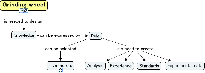 このコンセプトマップに関連する情報: 知識について(Eng.), Rule is a need to create Experience, Rule is a need to create Experimental data, Rule is a need to create Analysis, Rule can be selected Five factors, Grinding wheel is needed to design Knowledge, Knowledge can be expressed by Rule, Rule is a need to create Standards