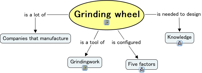 このコンセプトマップに関連する情報: 砥石(Eng), Grinding wheel is a tool of Grindingwork, Grinding wheel is needed to design Knowledge, Grinding wheel is a lot of Companies that manufacture, Grinding wheel is configured Five factors