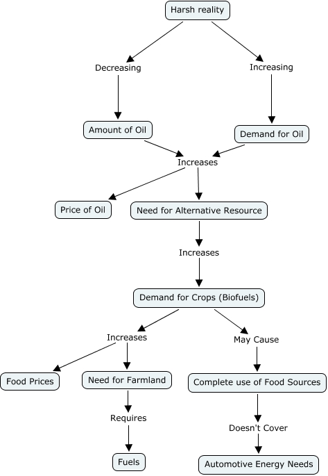 This Concept Map, created with IHMC CmapTools, has information related to: Procrastinate-Biofuels, Demand for Crops (Biofuels) Increases Food Prices, Complete use of Food Sources Doesn't Cover Automotive Energy Needs, Need for Farmland Requires Fuels, Harsh reality Decreasing Amount of Oil, Demand for Crops (Biofuels) Increases Need for Farmland, Harsh reality Increasing Demand for Oil, Need for Alternative Resource Increases Demand for Crops (Biofuels), Amount of Oil Increases Price of Oil, Demand for Crops (Biofuels) May Cause Complete use of Food Sources, Demand for Oil Increases Need for Alternative Resource, Demand for Oil Increases Price of Oil, Amount of Oil Increases Need for Alternative Resource