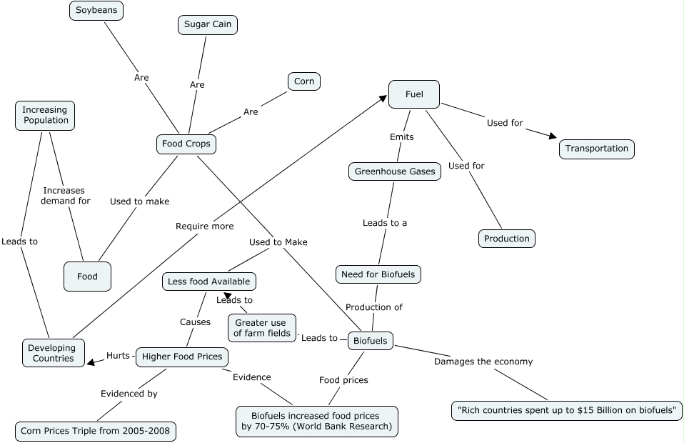 This Concept Map, created with IHMC CmapTools, has information related to: leaf food vs fuel, Greenhouse Gases Leads to a Need for Biofuels, Biofuels Leads to Greater use of farm fields, Less food Available Causes Higher Food Prices, Fuel Used for Transportation, Higher Food Prices Evidenced by Corn Prices Triple from 2005-2008, Higher Food Prices Evidence Biofuels increased food prices by 70-75% (World Bank Research), Biofuels Food prices Biofuels increased food prices by 70-75% (World Bank Research), Sugar Cain Are Food Crops, Food Crops Used to Make Less food Available, Need for Biofuels Production of Biofuels, Biofuels Damages the economy "Rich countries spent up to $15 Billion on biofuels", Higher Food Prices Hurts Developing Countries, Food Crops Used to Make Biofuels, Fuel Emits Greenhouse Gases, Developing Countries Require more Fuel, Increasing Population Increases demand for Food, Food Crops Used to make Food, Fuel Used for Production, Corn Are Food Crops, Increasing Population Leads to Developing Countries