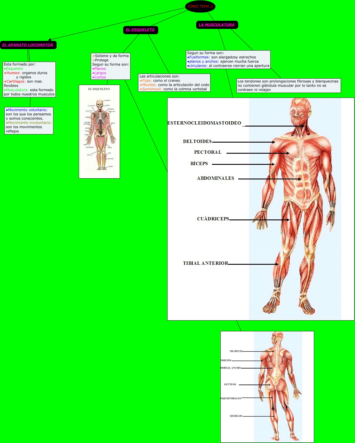 Este Cmap, tiene información relacionada con: cono tema 3, EL ESQUELETO ???? Las articulaciones son: ∗Fijas: como el craneo ∗Moviles: como la articulación del codo ∗Semimovil: como la colmna vertebal, CONO TEMA 3 ???? EL APARATO LOCOMOTOR, EL APARATO LOCOMOTOR ???? ∙Movimento voluntario: son los que los pensamos y somos conscientes. ∙Movimiento involuntario: son los movimientos reflejos, LA MUSCULATURA ???? Los tendones son prolongaciones fibrosas y blanquecinas no contienen glándula muscular por lo tanto no se contraen ni relajan, ∗Sotiene y da forma ∗Protege Segun su forma son: ∙Planos ∙Largos ∙Cortos ????, EL ESQUELETO ???? ∗Sotiene y da forma ∗Protege Segun su forma son: ∙Planos ∙Largos ∙Cortos, CONO TEMA 3 ???? EL ESQUELETO, ∗Sotiene y da forma ∗Protege Segun su forma son: ∙Planos ∙Largos ∙Cortos ????, CONO TEMA 3 ???? LA MUSCULATURA, EL APARATO LOCOMOTOR ???? Esta formado por: ∙Esqueleto ∗Huesos: organos duros y rigidos ∗Cartilagos: son mas flexibles ∙Musculatura: esta formado por todos nuestros musculos, Segun su forma son: ∙Fusiformes: son alargadosy estrechos ∙planos y anchos: ejercen mucha fuerza ∙circulares: al contraerse cierran una apertura ????, LA MUSCULATURA ???? Segun su forma son: ∙Fusiformes: son alargadosy estrechos ∙planos y anchos: ejercen mucha fuerza ∙circulares: al contraerse cierran una apertura