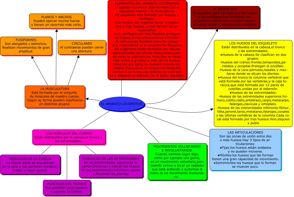 Este Cmap, tiene información relacionada con: cono tema 3 alba, LA MUSCULATURA Está formada por el conjunto de músculos de nuestro cuerpo. Según su forma pueden clasificarse en distintos grupos: ???? CIRCULARES Al contraerse pueden cerrar una abertura., EL APARATO LOCOMOTOR ???? LAS ARTICULACIONES Son las zonas de unión entre dos o más huesos.Hay 3 tipos de ar- ticulaciones: ∙Fijas:los huesos están soldados y no pueden moverse. ∙Móviles:los huesos que las forman tienen una gran capacidad de movimiento. ∙Semimóviles:los huesos que lo forman se mueven poco., EL APARATO LOCOMOTOR ???? MOVIMIENTOS VOLUNTARIOS E INVOLUNTARIOS. Cuando vamosa coger algo, como por ejemplo una goma, es un movimiento voluntario,pero cuando vamos a tocar un radiador que está ardiendo y quitamos la mano es un movimiento involunta- rio., LOS MÚSCULOS DEL CUERPO Están distribuidos por la cabeza,el tronco y las extremidades. ???? MÚSCULOS DEL TRONCO Nos permiten girar,levantar o agachar la cabeza., LOS MÚSCULOS DEL CUERPO Están distribuidos por la cabeza,el tronco y las extremidades. ???? MÚSCULOS DE LAS EXTREMIDADES En las extremidades superiores le- vantan,flexionan y estiran los brazos. En las extremidades inferiores estiran y flexionan las piernas., LA MUSCULATURA Está formada por el conjunto de músculos de nuestro cuerpo. Según su forma pueden clasificarse en distintos grupos: ???? FUSIFORMES Son alargados y estrechos. Realizan movimientos de gran amplitud., LOS MÚSCULOS DEL CUERPO Están distribuidos por la cabeza,el tronco y las extremidades. ???? MÚSCULOS DE LA CABEZA La mayor parte se encuentran en la cara y nos permiten masticar, hablar o hacer gestos., EL APARATO LOCOMOTOR ???? LOS MÚSCULOS DEL CUERPO Están distribuidos por la cabeza,el tronco y las extremidades., EL APARATO LOCOMOTOR ???? LOS HUESOS DEL ESQUELETO Están distribuidos en la cabeza,el tronco y las extremidades. ∙Huesos de la cabeza.Se clasifican en dos grupos: -Huesos del cráneo:frontal,temporales,pa- rietales y occipital.Protegen el encéfalo. -Huesos de la cara:pómulos,nasales y max- ilares donde se situan los dientes. ∙Huesos del tronco:la columna vertebral que está formada por las vertebras;y la caja to- rácica,que está formada por 12 pares de costillas unidas por el esternón. ∙Huesos de las extremidades: -Huesos de las extremidades superiores:hú- mero,cúbito,radio,antebrazo,carpo,metacarpo, falanges,clavícula y omóplato. -Huesos de las extremidades inferiores:fémur, tibia,peroné,tarso,metatarso,falanges,coxales y las últimas vertebras de la columna.Cada co- xal está formado por tres huesos:ilion,esquion y pubis, LA MUSCULATURA Está formada por el conjunto de músculos de nuestro cuerpo. Según su forma pueden clasificarse en distintos grupos: ???? PLANOS Y ANCHOS Pueden ejercer mucha fuerza y tienen un recorrido más corto., EL APARATO LOCOMOTOR ???? LA MUSCULATURA Está formada por el conjunto de músculos de nuestro cuerpo. Según su forma pueden clasificarse en distintos grupos:, EL APARATO LOCOMOTOR ???? ELEMENTOS DEL APARATO LOCOMOTOR El aparato locomotor,está formado por el esqueleto interno y la musculatura. ∙El esqueleto está formado por huesos y cartílagos. -Los huesos son órganos duros y rígidos. Dos o más huesos unidos forman las ar- tículaciones. -Los cartílagos son más flexibles,protegen los huesos en las artículaciones y forman- do estructuras flexibles como las orejas. ∙La musculatura es el conjunto de músculos del organismo.Están formados por células especializadas,las células musculares,cuan- do estas se contraen,los músculos se hacen más cortos y gruesos y tiran de los huesos haciendo que estos se muevan.Cuando las celulas musculares se relajan,los músculos vuelven a su forma.Las órdenes de contraer- se y relajarse se elaboran en el bulbo raquídeo., EL APARATO LOCOMOTOR ???? EL ESQUELETO El esqueleto está formado por los huesos y los cartílagos.Sus funciones son: ∙Sostiene y da forma a nuestro cuerpo. ∙Protege órganos importantes y frágiles.
