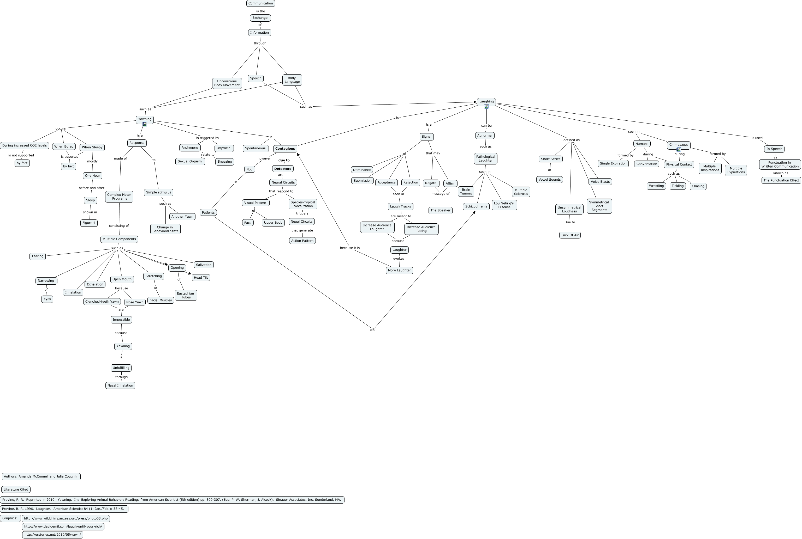 This Concept Map, created with IHMC CmapTools, has information related to: Coughlin McConnell Communication, Laughter evokes More Laughter, Simple stimulus such as Another Yawn, Yawning occurs During increased CO2 levels, Laugh Tracks are meant to Increase Audience Rating, Punctuation in Written Communication known as The Punctuation Effect, Pathological Laughter seen in Brain Tumors, Pathological Laughter seen in Schizophrenia, Oxytocin relate to Sneezing, Visual Pattern of Face, Laughing is a Signal, Laughing can be Abnormal, Multiple Components such as Exhalation, Androgens relate to Sexual Orgasm, Signal that may Negate, Humans during Physical Contact, Species-Typical Vocalization triggers Neual Circuits, Yawning occurs When Sleepy, Response to Simple stimulus, Open Mouth because Clenched-teeth Yawn, Laugh Tracks are meant to Increase Audience Laughter
