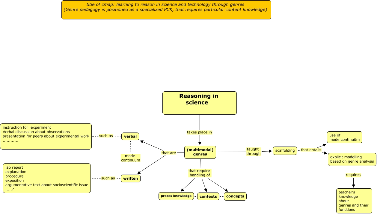 Deze Concept Map heeft informatie gerelateerd aan: learning to reason in science and technology through genres, (multimodal) genres that require handling of concepts, (multimodal) genres that require handling of proces knowledge, Reasoning in science takes place in (multimodal) genres, scaffolding that entails use of mode continuüm, explicit modelling based on genre analysis requires teacher's knowledge about genres and their functions, (multimodal) genres taught through scaffolding, verbal such as instruction for experiment Verbal discussion about observations presentation for peers about experimental work ............, proces knowledge contexts, (multimodal) genres that are written, (multimodal) genres that are verbal, verbal mode continuüm written, concepts contexts, (multimodal) genres that require handling of contexts, written such as lab report explanation procedure exposition argumentative text about socioscientific issue .....?, scaffolding that entails explicit modelling based on genre analysis