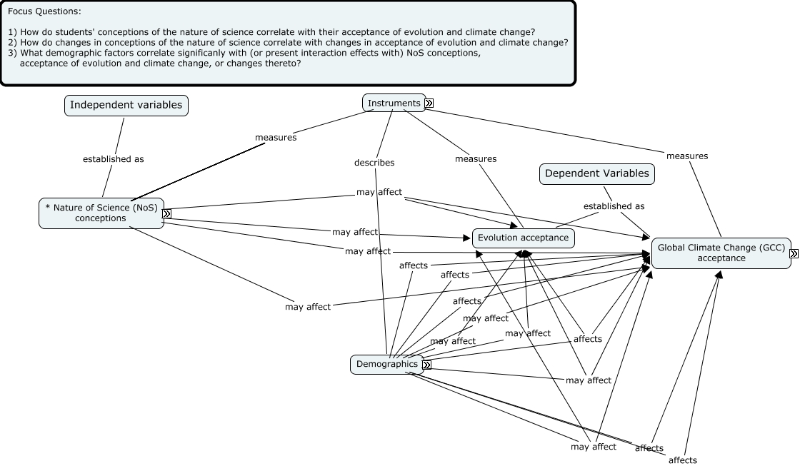 This Concept Map, created with IHMC CmapTools, has information related to: NoSEvoandGCC, TSSI measures Vital for Economy, Youth Science Exposure may affect Global Climate Change (GCC) acceptance, TSSI measures Open to people regardless of race or gender, TSSI measures Important for all people, Political Party affects Global Climate Change (GCC) acceptance, Dependent Variables established as Global Climate Change (GCC) acceptance, Should influence policy, be publicly funded, not publicly controlled may affect Global Climate Change (GCC) acceptance, Demographics Survey describes Demographics, Neutral w/ regard to religion and morality may affect Evolution acceptance, Epistemology may affect Evolution acceptance, Dependent Variables established as Evolution acceptance, General Political Views divide into Fiscal Political Views, Religious affiliation may affect Evolution acceptance, TSSI measures Positive for Public Health, Region affects Global Climate Change (GCC) acceptance, Religiosity affects Global Climate Change (GCC) acceptance, Parents' education level may affect Evolution acceptance, MATE measures Evolution acceptance, Youth Science Exposure may affect Evolution acceptance, General Political Views divide into Social Political Views