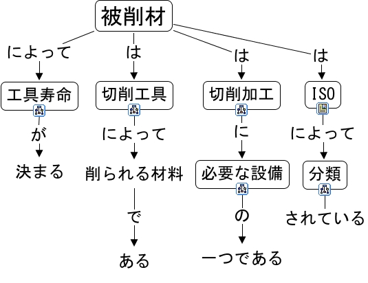 このコンセプトマップに関連する情報: 被削材, 切削工具 によって 削られる材料, 被削材 は 切削加工, 必要な設備 の 一つである, 分類 されている, 工具寿命 が 決まる, 切削加工 に 必要な設備, ISO によって 分類, 被削材 は ISO, 被削材 は 切削工具, 被削材 によって 工具寿命, 削られる材料 で ある