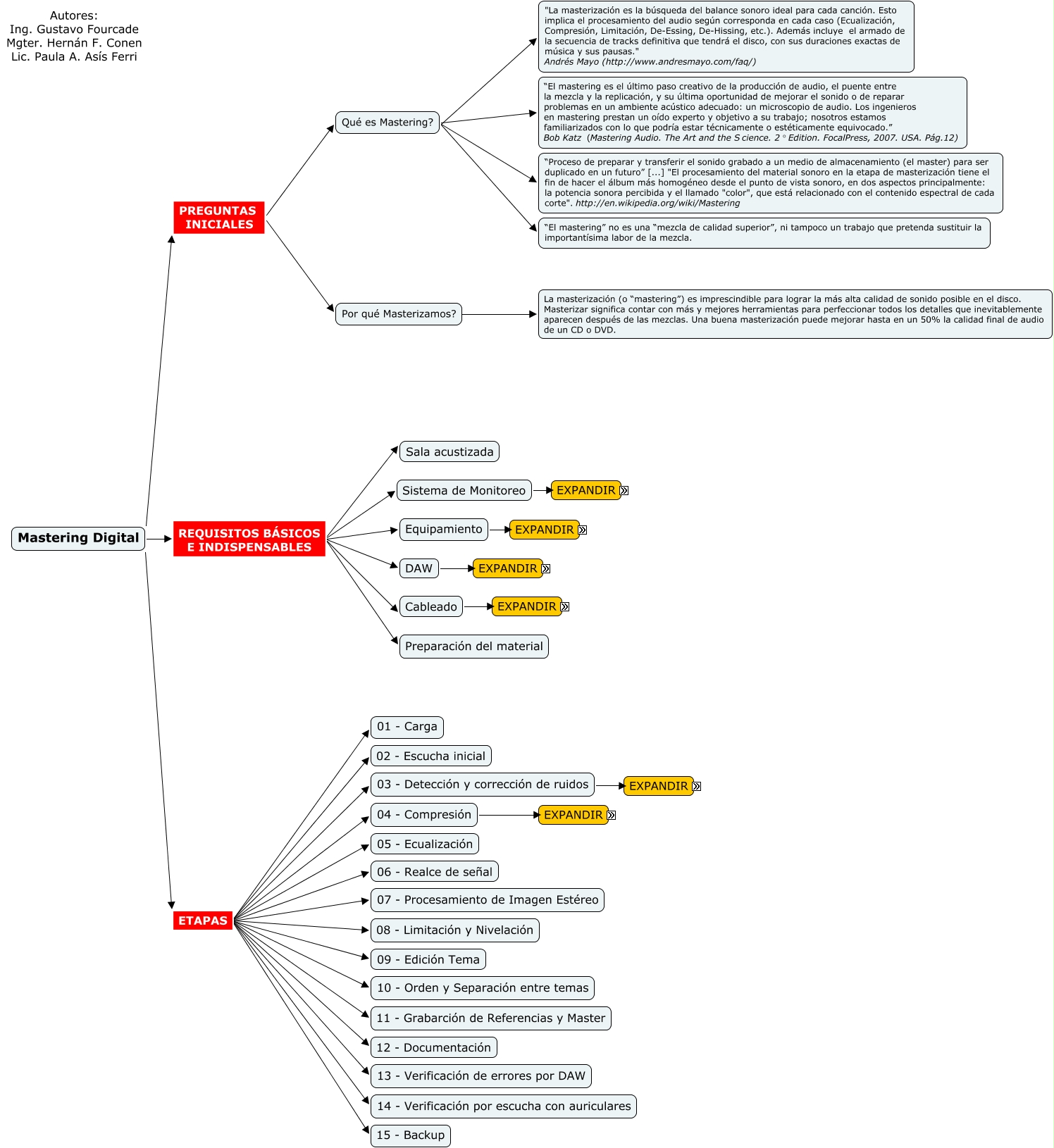 Este Cmap, tiene información relacionada con: Mastering Digital, Equipamiento PROCESADORES EXTERNOS CONVERSORES A/D - APOGEE (Rosetta Series, Symphony, X-Series) - PrismSound (ADA-8XR, AD-2, DA-2) - Lynx (Aurora) - Mytek (8X192 Series) - LE LVRY ENGINEERING (AD122-96 MKIII, 4496, AD10, DA11) - DIGITAL AUDIO DENMARK (DAD AX24, AX32...) - BENCHMARK (ADC1 - DAC1 -, Sistema de Monitoreo CARACTERÍSTICAS GENERALES - "...observación del curso de uno o más parámetros para detectar eventuales anomalías" - Equipo más importante de la cadena, considerado como “El microscopio de audio”, 03 - Detección y corrección de ruidos CLICK - Problema común en audio digital. Greneralmente, debido a problemas ce clock, malos cables y/o terminación - Sacarlos a mano antes que con un proceso que afecta todo el track, puede generar artifacts o reducir ataques a ciertas partes, Sistema de Monitoreo CARACTERÍSTICAS GENERALES AMPLIFICADORES - Generosos en potencia - Rápidos en respuesta (slew rate), 04 - Compresión CONSIDERAR En Mastering: - Compresores para cambiar el sonido intencionalmente - Limitadores para cambiar poco el sonido pero subir el nivel Considerar que disminuimos el ataque (transitorios) Se reduce el RD pero le da impacto a las secciones suaves o medianas Como los Eqs, cada uno tiene su “carácter”, lo que mismos parámetros en uno puede ser suave y en otro más agresivo, Mastering Digital PREGUNTAS INICIALES Por qué Masterizamos?, Equipamiento PROCESADORES EXTERNOS Realzadores, Mastering Digital PREGUNTAS INICIALES Qué es Mastering?, Equipamiento PROCESADORES EXTERNOS LIMITADORES - Teletronix Engineering (LA-2A) - Universal Audio (1176LN Limiter Amplifier LA-3A), Equipamiento PROCESADORES EXTERNOS Imagen stereo, DAW DAW (DIGITAL AUDIO WOEKSTATION) Y PROGRAMAS DE TRABAJO - DAW MAC: Sonic Solutions HD Mac, BIAS Peak Mac. - DAW PC: SADiE, Sequoia, Pyramix, Sound Forge, Wavelab - Plug-in dedicado: T-Racks, Ozone, Waves, Voxengo Master Bundles - HW dedicado: TC Electronic Finalizer, DBX Quantum II y específicos, Mastering Digital ETAPAS 05 - Ecualización, Mastering Digital ETAPAS 10 - Orden y Separación entre temas, Por qué Masterizamos? ???? La masterización (o “mastering”) es imprescindible para lograr la más alta calidad de sonido posible en el disco. Masterizar significa contar con más y mejores herramientas para perfeccionar todos los detalles que inevitablemente aparecen después de las mezclas. Una buena masterización puede mejorar hasta en un 50% la calidad final de audio de un CD o DVD., Manual: - Equilibrando secciones - Atenuar picos antes de que ocurran Parámetros: - Threshold (umbral) - Ratio (relación) ᡂ:1 Limitador - Attack Time (t ataque) - Release, Recovery Time (t recuperación) - MakeUp Gain (ganancia de salida) - Knee (transición entre no comprimido y comprimido): Hard Knee, Soft Knee, Knee variable SETEOS TÍPICOS - Treshold: entre -8 y -20 dBfs - Ratio: entre 1.5 y 3:1 - Attack: entre 50 y 500 ms - Release: entre 50 y 500 ms (150-250) Release corto genera distorsión en graves Breathing o pumping, Mastering Digital ETAPAS 13 - Verificación de errores por DAW, Cableado CONSIDERACIONES GENERALES INSTALACIÓN ELÉCTRICA - Alimentación independiente - Puesta a tierra independiente - T.A.G. - Tablero secundario - Circuitos - Señalización, Qué es Mastering? ???? "La masterización es la búsqueda del balance sonoro ideal para cada canción. Esto implica el procesamiento del audio según corresponda en cada caso (Ecualización, Compresión, Limitación, De-Essing, De-Hissing, etc.). Además incluye el armado de la secuencia de tracks definitiva que tendrá el disco, con sus duraciones exactas de música y sus pausas." Andrés Mayo (http://www.andresmayo.com/faq/), Mastering Digital REQUISITOS BÁSICOS E INDISPENSABLES DAW, Mastering Digital REQUISITOS BÁSICOS E INDISPENSABLES Equipamiento