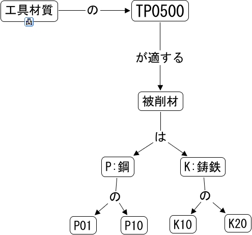 このコンセプトマップに関連する情報: TP0500, 被削材 は K:鋳鉄, K:鋳鉄 の K10, P:鋼 の P01, TP0500 が適する 被削材, P:鋼 の P10, K:鋳鉄 の K20, 工具材質 の TP0500, 被削材 は P:鋼