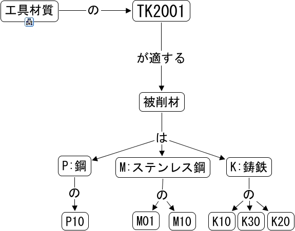 このコンセプトマップに関連する情報: TK2001, 工具材質 の TK2001, 被削材 は M:ステンレス鋼, K:鋳鉄 の K30, 被削材 は P:鋼, K:鋳鉄 の K20, P:鋼 の P10, 被削材 は K:鋳鉄, TK2001 が適する 被削材, M:ステンレス鋼 の M10, M:ステンレス鋼 の M01, K:鋳鉄 の K10