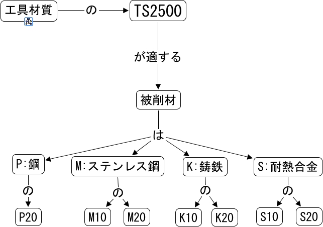 このコンセプトマップに関連する情報: TS2500, 被削材 は P:鋼, K:鋳鉄 の K10, M:ステンレス鋼 の M10, S:耐熱合金 の S10, P:鋼 の P20, M:ステンレス鋼 の M20, 工具材質 の TS2500, 被削材 は S:耐熱合金, K:鋳鉄 の K20, 被削材 は K:鋳鉄, S:耐熱合金 の S20, TS2500 が適する 被削材, 被削材 は M:ステンレス鋼