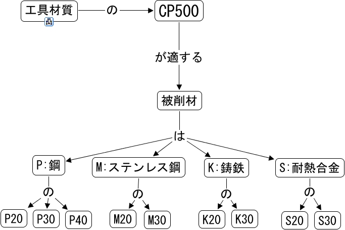 このコンセプトマップに関連する情報: CP500, P:鋼 の P30, M:ステンレス鋼 の M20, M:ステンレス鋼 の M30, S:耐熱合金 の S20, K:鋳鉄 の K30, 工具材質 の CP500, S:耐熱合金 の S30, K:鋳鉄 の K20, P:鋼 の P40, 被削材 は P:鋼, CP500 が適する 被削材, P:鋼 の P20, 被削材 は M:ステンレス鋼, 被削材 は K:鋳鉄, 被削材 は S:耐熱合金