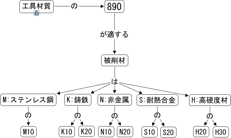 このコンセプトマップに関連する情報: 890, 被削材 は K:鋳鉄, N:非金属 の N10, 被削材 は H:高硬度材, K:鋳鉄 の K20, S:耐熱合金 の S20, M:ステンレス鋼 の M10, 890 が適する 被削材, N:非金属 の N20, 被削材 は S:耐熱合金, 被削材 は M:ステンレス鋼, H:高硬度材 の H30, H:高硬度材 の H20, S:耐熱合金 の S10, K:鋳鉄 の K10, 被削材 は N:非金属, 工具材質 の 890