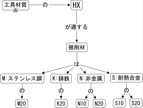 このコンセプトマップに関連する情報: HX, 被削材 は K:鋳鉄, N:非金属 の N10, K:鋳鉄 の K20, S:耐熱合金 の S20, M:ステンレス鋼 の M20, HX が適する 被削材, N:非金属 の N20, 被削材 は S:耐熱合金, 被削材 は M:ステンレス鋼, S:耐熱合金 の S10, 被削材 は N:非金属, 工具材質 の HX
