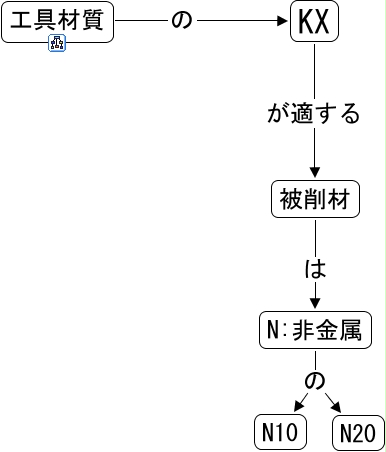 このコンセプトマップに関連する情報: KX, N:非金属 の N10, KX が適する 被削材, N:非金属 の N20, 被削材 は N:非金属, 工具材質 の KX