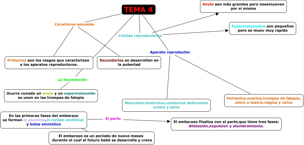 Este Cmap, tiene información relacionada con: tema 4, En las primeras fases del embarazo se forman la placenta,el cordon umbilical y bolsa amniotica El parto El embarazo finaliza con el parto,que tiene tres fases: dilatazión,expulsion y alumbramiento., TEMA 4 Caracteres sexuales Primarios son los rasgos que caracterizan a los aparatos reproductores., TEMA 4 Aparato reproductor Masculino:testiculos,conductos deferentes uretra y pene, TEMA 4 La fecundación Ocurre cunado un ovulo y un espermatozoide se unen en las trompas de falopio, En las primeras fases del embarazo se forman la placenta,el cordon umbilical y bolsa amniotica ???? El embarazo es un período de nueve meses durante el cual el futuro bebé se desarrolla y crece, TEMA 4 Aparato reproductor Femenino:ovarios,trompas de falopio, utero o matriz,vagina y vulva, TEMA 4 Celulas reproductoras Espermatozoides son pequeños pero se muev muy rapido, TEMA 4 Caracteres sexuales Secundarios se desarrollan en la pubertad, TEMA 4 Celulas reproductoras Ovulo son más grandes pero nosemueven por sí mismo