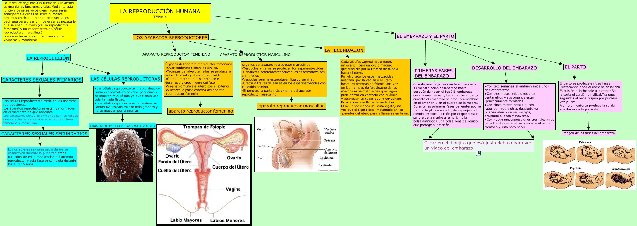 Este Cmap, tiene información relacionada con: tema 4 cono isabel, Las células reproductoras están en los aparatos reproductores. Los aparatos reprodactores están ya formados en el momento en que nacemos. Los caracteres sexuales primarios son los rasgos que caracterizan a los aparatos reproductores femenino y masculino. ???? CARACTERES SEXUALES SECUNDARIOS, EL PARTO ???? El parto se produce en tres fases: Dilatación:cuando el útero se ensancha. Expulsión:el bebé sale al exterior.Se le corta el cordón umbilical.Tra unos segundos el bebé respira por primera vez y llora. Alumbramiento:se produce la salida al exterior de la placenta., LA REPRODUCCIÓN HUMANA TEMA 4 ???? LA REPRODUCCIÓN, El parto se produce en tres fases: Dilatación:cuando el útero se ensancha. Expulsión:el bebé sale al exterior.Se le corta el cordón umbilical.Tra unos segundos el bebé respira por primera vez y llora. Alumbramiento:se produce la salida al exterior de la placenta. ???? imagen de las fases del embarazo, Órganos del aparato reproductor masculino: -Testículos:en ellos se producen los espermatozoides. -Conductos deferentes:conducen los espermatozoides a la uretra. -Vesículas seminales:producen líquido seminal. -Uretra:a través de ella salen los espermatozoides con el líquido seminal. -El pene:es la parte más externa del aparato reproductor masculino. ???? aparato reproductor masculino, CARACTERES SEXUALES SECUNDARIOS ???? Los caracteres sexuales secundarios se desarroyan durante la pubertad,etapa que consiste en la maduración del aparato reproductor y esta fase se completa durante los 11 y 15 años., Órganos del aparato reproductor femenino: ∙Ovarios:dentro tienen los óvulos. ∙Trompas de falopio:en ellas se produce la unión del óvulo y el espermetozoide. ∙Útero o matriz:en él se produce el desarroyo y crecimiento del feto. ∙Vagina:comunica el útero con el exterior. ∙Vulva:es la parte externa del aparato reproductor femenino. ???? aparato reproductor femenino, LA FECUNDACIÓN ???? Cada 28 días ,aproximadamente, un ovario libera un óvulo maduro que discurre por la trompa de falopio hacia el útero. Por otro lado los espermatozoides avanzan por la vagina y el útero hasta las trompas de falopio.Una vez en las trompas de falopio,uno de los muchos espermatozoides que llegan pude entrar en contacto con el óvulo y atravesar las capas que lo envuelven. Este proceso se llama fecundación. El óvulo fecundado se llama cigoto,una vez que el cigoto está implantado en las paredes del utero pasa a llamarse embrión., CARACTERES SEXUALES PRIMARIOS ???? Las células reproductoras están en los aparatos reproductores. Los aparatos reprodactores están ya formados en el momento en que nacemos. Los caracteres sexuales primarios son los rasgos que caracterizan a los aparatos reproductores femenino y masculino., LA REPRODUCCIÓN ???? LAS CÉLULAS REPRODUCTORAS, LOS APARATOS REPRODUCTORES APARATO REPRODUCTOR MASCULINO Órganos del aparato reproductor masculino: -Testículos:en ellos se producen los espermatozoides. -Conductos deferentes:conducen los espermatozoides a la uretra. -Vesículas seminales:producen líquido seminal. -Uretra:a través de ella salen los espermatozoides con el líquido seminal. -El pene:es la parte más externa del aparato reproductor masculino., PRIMERAS FASES DEL EMBARAZO ???? Cuando una mujer se queda embarazada su menstruación desaparece hasta después de nacer el bebé.El embarazo dura nueve meses y termina con el parto, durante el embarazo se producen cambios en el embrion y en el cuerpo de la madre. Durante las primeras fases del embarazo se forman la placenta:un tejido esponjoso,el cordón umbilical:cordón por el que pasa la sangre de la madre al embrion y la bolsa amniótica:una bolsa llena de líquido que protege al embrión., EL EMBARAZO Y EL PARTO ???? PRIMERAS FASES DEL EMBARAZO, EL EMBARAZO Y EL PARTO ???? DESARROLLO DEL EMBARAZO, ∙Las células reproductoras masculainas se llaman espermatozoides.Son pequeñas y se mueven muy rápido ya que tienen una cola llamada flageo. ∙Las células reproductoras femeninas se llaman óvulos.Son mucho más grandes y no se mueven por si mismas. ???? IMAGEN DE ÓVULO Y ESPERMATOZOIDES, Cuando una mujer se queda embarazada su menstruación desaparece hasta después de nacer el bebé.El embarazo dura nueve meses y termina con el parto, durante el embarazo se producen cambios en el embrion y en el cuerpo de la madre. Durante las primeras fases del embarazo se forman la placenta:un tejido esponjoso,el cordón umbilical:cordón por el que pasa la sangre de la madre al embrion y la bolsa amniótica:una bolsa llena de líquido que protege al embrión. ???? Clicar en el dibujito que esá justo debajo para ver un vídeo del embarazo., ∙Con cico semanas:el embrión mide unos dos centímetros. ∙Con tres meses:mide unos diez centímetros y sus órganos están practicamente formados. ∙Con cinco meses:pasa algunos ratos dormido y otros despierto,ya pueden abrir y cerrar los ojos, chuparse el dedo y moverse. ∙Con nueve meses:pesa unos tres kilos,mide unos treinte centímetros y está totalmente formado y listo para nacer. ???? Clicar en el dibujito que esá justo debajo para ver un vídeo del embarazo., DESARROLLO DEL EMBARAZO ???? ∙Con cico semanas:el embrión mide unos dos centímetros. ∙Con tres meses:mide unos diez centímetros y sus órganos están practicamente formados. ∙Con cinco meses:pasa algunos ratos dormido y otros despierto,ya pueden abrir y cerrar los ojos, chuparse el dedo y moverse. ∙Con nueve meses:pesa unos tres kilos,mide unos treinte centímetros y está totalmente formado y listo para nacer., LOS APARATOS REPRODUCTORES ???? LA FECUNDACIÓN, LA REPRODUCCIÓN HUMANA TEMA 4 ???? EL EMBARAZO Y EL PARTO