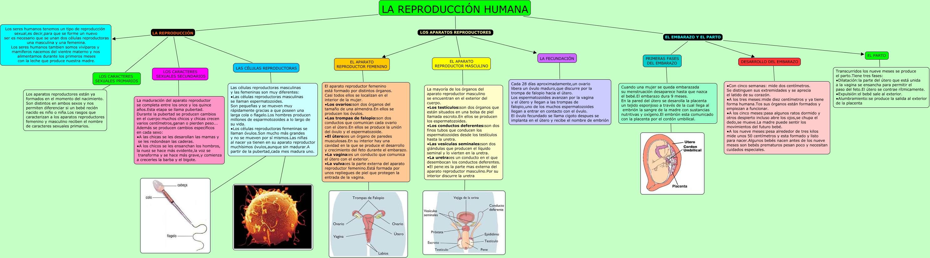 Este Cmap, tiene información relacionada con: CONO TEMA 4 MARÍA, LA REPRODUCCIÓN HUMANA EL EMBARAZO Y EL PARTO PRIMERAS FASES DEL EMBARAZO, LAS CÉLULAS REPRODUCTORAS ???? Las células reproductoras masculinas y las femeninas son muy diferentes: ∙Las células reproductoras masculinas se llaman espermatozoides. Son pequeñas y se mueven muy rápidamente gracias a que poseen una larga cola o flagelo.Los hombres producen millones de esparmotozoides a lo largo de su vida. ∙Los células reproductoras femeninas se llaman óvulos.Son mucho más grandes y no se mueven por sí mismos.Las niñas al nacer ya tienen en su aparato reproductor muchísimos óvulos,aunque sin madurar.A partir de la pubertad,cada mes madura uno., EL APARATO REPRODUCTOR FEMENINO ???? El aparato reproductor femenino está formado por distintos órganos. Casi todos ellos se localizan en el interior de la mujer. ∙Los ovarios:son dos órganos del tamaño de una almendra.En ellos se producen los óvulos. ∙Las trompas de falopio:son dos conductos que comunican cada ovario con el útero.En ellos se produce la unión del óvulo y el espermatozoide. ∙El útero:es un órgano de paredes musculosas.En su interior hay una cavidad en la que se produce el desarrollo y crecimiento del feto durante el embarazo. ∙La vagina:es un conducto que comunica el útero con el exterior. ∙La vulva:es la parte externa del aparato reproductor femenino.Está formada por unos repliegues de piel que protegen la entrada de la vagina., DESARROLLO DEL EMBARAZO ???? ∙Con cinco semanas: mide dos centímetros. Se distinguen sus extremidades y se aprecia el latido de su corazón. ∙A los tres meses:mide diez centímetros y ya tiene forma humana.Tos sus órganos están formados y empiezan a funcionar. ∙A los cinco meses:pasa algunos ratos dormido y otros despierto incluso abre los ojos,se chupa el dedo,se mueve.La madre puede sentir los movimientos del futuro bebé. ∙A los nueve meses:pesa alrededor de tres kilos mide unos 50 centímetros y esta formado y listo para nacer.Algunos bebés nacen antes de los nueve meses son bebés prematuros pesan poco y necesitan cuidados especiales., PRIMERAS FASES DEL EMBARAZO ???? Cuando una mujer se queda embarazada su menstruación desaparece hasta que nazca el bebé.El embarazo dura 9 meses. En la pared del útero se desarolla la placenta un tejido esponjoso a través de la cual llega al embrión la sangre de la madre con sustancias nutritivas y oxígeno.El embrión esta comunicado con la placenta por el cordón umbilical., LOS CARACTERES SEXUALES SECUNDARIOS ???? La maduración del aparato reproductor se completa entre los once y los quince años.Esta etapa se llama pubertad. Durante la pubertad se producen cambios en el cuerpo:muchos chicos y chicas crecen varios centímetros,ganan o pierden peso... Además se producen cambios especificos en cada sexo: ∙A las chicas se les desarollan las mamas y se les redondean las caderas. ∙A los chicos se les ensanchan los hombros, la nuez se hace más evidente,la voz se transforma y se hace más grave,y comienza a crecerles la barba y el bigote., EL APARATO REPRODUCTOR MASCULINO ???? La mayoría de los órganos del aparato reproductor masculino se encuentran en el exterior del cuerpo. ∙Los testículos:son dos órganos que están situados en una bolsa de piel llamada escroto.En ellos se producen los espermatozoides. ∙Los conductos deferentes:son dos finos tubos que conducen los espermatozoides desde los testículos hasta la uretra. ∙Las vesículas seminales:son dos glándulas que producen el líquido seminal y lo vierten en la uretra. ∙La uretra:es un conducto en el que desembocan los conductos deferentes. ∙El pene:es la parte mas externa del aparato reproductor masculino.Por su interior discurre la uretra, Cuando una mujer se queda embarazada su menstruación desaparece hasta que nazca el bebé.El embarazo dura 9 meses. En la pared del útero se desarolla la placenta un tejido esponjoso a través de la cual llega al embrión la sangre de la madre con sustancias nutritivas y oxígeno.El embrión esta comunicado con la placenta por el cordón umbilical. ????, Las células reproductoras masculinas y las femeninas son muy diferentes: ∙Las células reproductoras masculinas se llaman espermatozoides. Son pequeñas y se mueven muy rápidamente gracias a que poseen una larga cola o flagelo.Los hombres producen millones de esparmotozoides a lo largo de su vida. ∙Los células reproductoras femeninas se llaman óvulos.Son mucho más grandes y no se mueven por sí mismos.Las niñas al nacer ya tienen en su aparato reproductor muchísimos óvulos,aunque sin madurar.A partir de la pubertad,cada mes madura uno. ????, Las células reproductoras masculinas y las femeninas son muy diferentes: ∙Las células reproductoras masculinas se llaman espermatozoides. Son pequeñas y se mueven muy rápidamente gracias a que poseen una larga cola o flagelo.Los hombres producen millones de esparmotozoides a lo largo de su vida. ∙Los células reproductoras femeninas se llaman óvulos.Son mucho más grandes y no se mueven por sí mismos.Las niñas al nacer ya tienen en su aparato reproductor muchísimos óvulos,aunque sin madurar.A partir de la pubertad,cada mes madura uno. ????, LOS CARACTERES SEXUALES PRIMARIOS ???? Los aparatos reproductores están ya formados en el momento del nacimiento. Son distintos en ambos sexos y nos permiten diferenciar si un bebé recién nacido es niño o niña.Los rasgos que caracterizan a los aparatos reproductores femenino y masculino reciben el nombre de caracteres sexuales primarios., LA REPRODUCCIÓN HUMANA LA REPRODUCCIÓN Los seres humanos tenemos un tipo de reproducción sexual,es decir,para que se forme un nuevo ser es necesario que se unan dos células reproductoras una masculina y una femenina. Los seres humanos tambien somos vivíparos y mamíferos nacemos del vientre materno y nos alimentamos durante los primeros meses con la lech