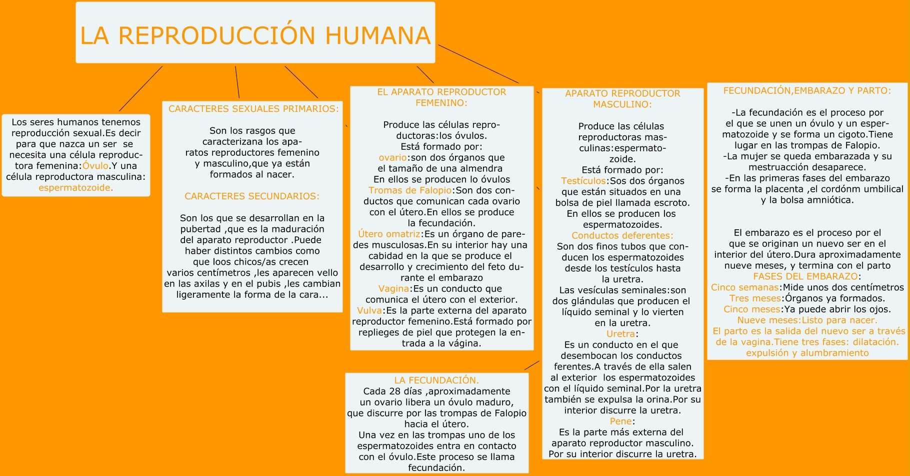 Este Cmap, tiene información relacionada con: tema 4 CONO Jorge F CH, LA REPRODUCCIÓN HUMANA ???? Los seres humanos tenemos reproducción sexual.Es decir para que nazca un ser se necesita una célula reproduc- tora femenina:Óvulo.Y una célula reproductora masculina: espermatozoide., LA REPRODUCCIÓN HUMANA ???? CARACTERES SEXUALES PRIMARIOS: Son los rasgos que caracterizana los apa- ratos reproductores femenino y masculino,que ya están formados al nacer. CARACTERES SECUNDARIOS: Son los que se desarrollan en la pubertad ,que es la maduración del aparato reproductor .Puede haber distintos cambios como que loos chicos/as crecen varios centímetros ,les aparecen vello en las axilas y en el pubis ,les cambian ligeramente la forma de la cara..., LA REPRODUCCIÓN HUMANA ???? EL APARATO REPRODUCTOR FEMENINO: Produce las células repro- ductoras:los óvulos. Está formado por: ovario:son dos órganos que el tamaño de una almendra En ellos se producen lo óvulos Tromas de Falopio:Son dos con- ductos que comunican cada ovario con el útero.En ellos se produce la fecundación. Útero omatriz:Es un órgano de pare- des musculosas.En su interior hay una cabidad en la que se produce el desarrollo y crecimiento del feto du- rante el embarazo Vagina:Es un conducto que comunica el útero con el exterior. Vulva:Es la parte externa del aparato reproductor femenino.Está formado por replieges de piel que protegen la en- trada a la vágina., LA REPRODUCCIÓN HUMANA ???? APARATO REPRODUCTOR MASCULINO: Produce las células reproductoras mas- culinas:espermato- zoide. Está formado por: Testículos:Sos dos órganos que están situados en una bolsa de piel llamada escroto. En ellos se producen los espermatozoides. Conductos deferentes: Son dos finos tubos que con- ducen los espermatozoides desde los testículos hasta la uretra. Las vesículas seminales:son dos glándulas que producen el líquido seminal y lo vierten en la uretra. Uretra: Es un conducto en el que desembocan los conductos ferentes.A través de ella salen al exterior los espermatozoides con el líquido seminal.Por la uretra también se expulsa la orina.Por su interior discurre la uretra. Pene: Es la parte más externa del aparato reproductor masculino. Por su interior discurre la uretra., APARATO REPRODUCTOR MASCULINO: Produce las células reproductoras mas- culinas:espermato- zoide. Está formado por: Testículos:Sos dos órganos que están situados en una bolsa de piel llamada escroto. En ellos se producen los espermatozoides. Conductos deferentes: Son dos finos tubos que con- ducen los espermatozoides desde los testículos hasta la uretra. Las vesículas seminales:son dos glándulas que producen el líquido seminal y lo vierten en la uretra. Uretra: Es un conducto en el que desembocan los conductos ferentes.A través de ella salen al exterior los espermatozoides con el líquido seminal.Por la uretra también se expulsa la orina.Por su interior discurre la uretra. Pene: Es la parte más externa del aparato reproductor masculino. Por su interior discurre la uretra. ???? LA FECUNDACIÓN. Cada 28 días ,aproximadamente un ovario libera un óvulo maduro, que discurre por las trompas de Falopio hacia el útero. Una vez en las trompas uno de los espermatozoides entra en contacto con el óvulo.Este proceso se llama fecundación., LA REPRODUCCIÓN HUMANA ???? FECUNDACIÓN,EMBARAZO Y PARTO: -La fecundación es el proceso por el que se unen un óvulo y un esper- matozoide y se forma un cigoto.Tiene lugar en las trompas de Falopio. -La mujer se queda embarazada y su mestruacción desaparece. -En las primeras fases del embarazo se forma la placenta ,el cordónm umbilical y la bolsa amniótica. El embarazo es el proceso por el que se originan un nuevo ser en el interior del útero.Dura aproximadamente nueve meses, y termina con el parto FASES DEL EMBARAZO: Cinco semanas:Mide unos dos centímetros Tres meses:Órganos ya formados. Cinco meses:Ya puede abrir los ojos. Nueve meses:Listo para nacer. El parto es la salida del nuevo ser a través de la vagina.Tiene tres fases: dilatación. expulsión y alumbramiento