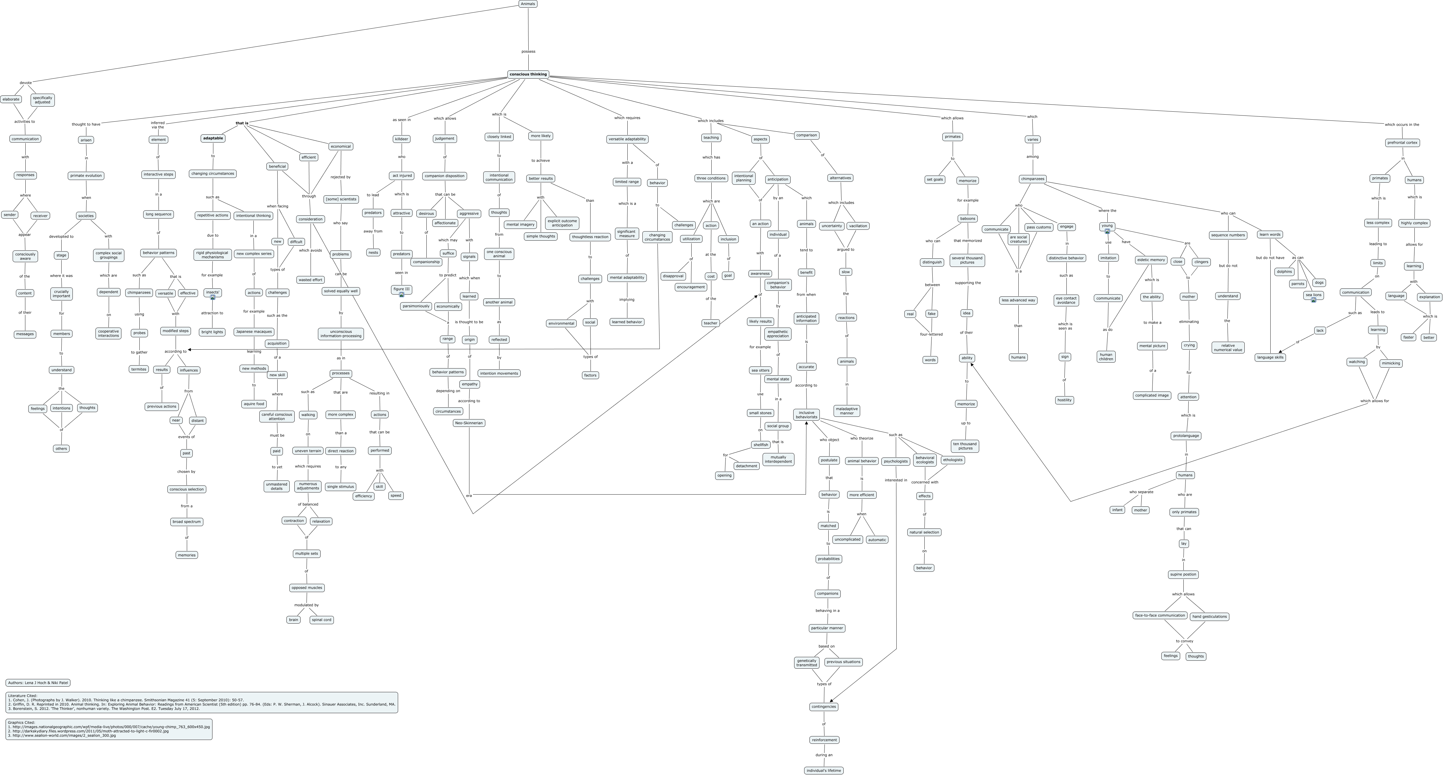This Concept Map, created with IHMC CmapTools, has information related to: Hoch Patel Animal Cognition, primates which is less complex, conscious thinking that is economical, communication with responses, inclusive behaviorists such as ethologists, beneficial when facing diffcult, responses where receiver, utilization of disapproval, mental state in a social group, animals tend to benefit, comparison of alternatives, inclusive behaviorists such as behavioral ecologists, shellfish for detachment, chimpanzees using probes, Japanese macaques learning new methods, hand gesticulations to convey thoughts, benefit from when anticipated information, distinctive behavior such as eye contact avoidance, understand the feelings, unconscious information-processing as in processes, chimpanzees where the young