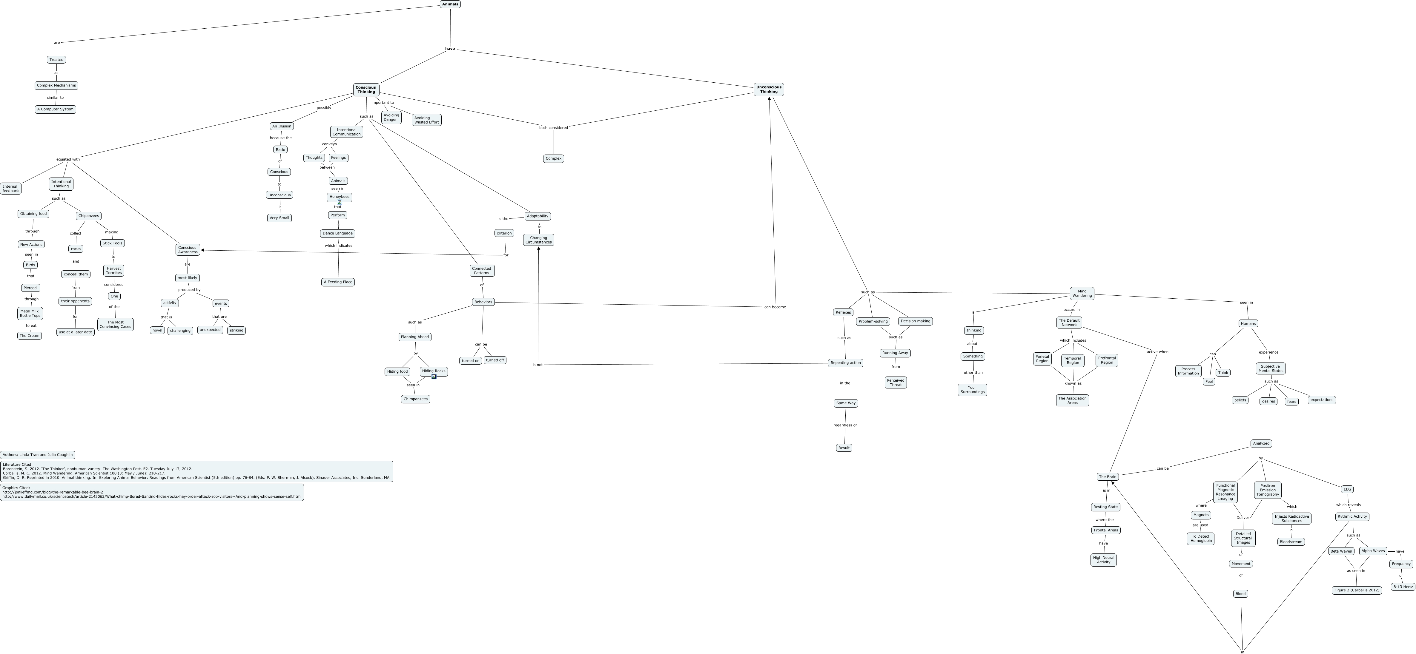 This Concept Map, created with IHMC CmapTools, has information related to: Coughlin Tran Animal Cognition, Functional Magnetic Resonance Imaging where Magnets, Reflexes such as Repeating action, Feelings between Animals, The Brain can be Analyzed, Animals are Treated, Repeating action is not Changing Circumstances, Frequency of 8-13 Hertz, Frequency of 8-13 Hertz, Hiding food seen in Chimpanzees, The Brain is in Resting State, Subjective Mental States such as beliefs, Frontal Areas have High Neural Activity, Humans can Feel, Pierced through Metal Milk Bottle Tops, Subjective Mental States such as expectations, Subjective Mental States such as fears, Chipanzees making Stick Tools, Animals have Unconscious Thinking, Unconscious Thinking such as Decision making, activity that is novel