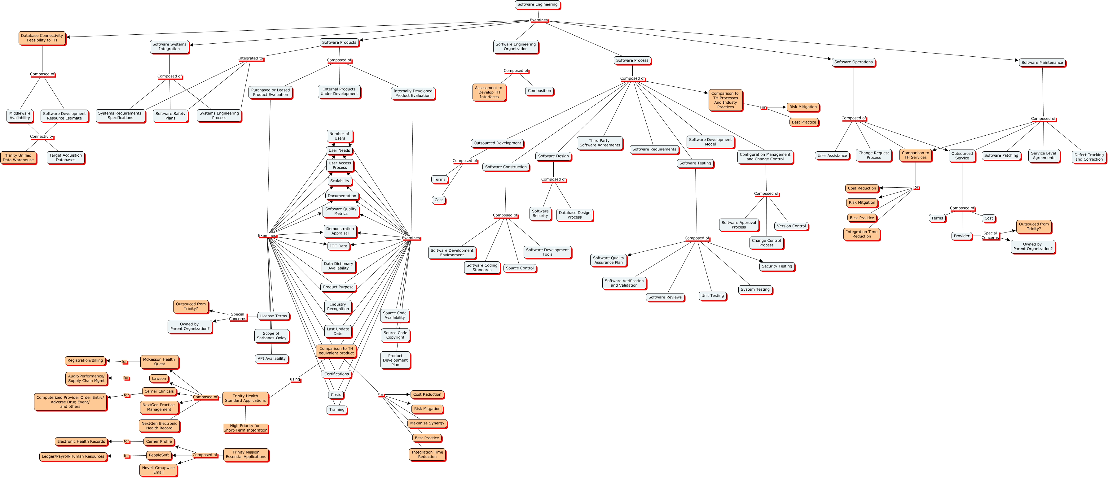 This Concept Map, created with IHMC CmapTools, has information related to: SE Integration Map v3, Internally Developed Product Evaluation Examines Comparison to TH equivalent product, Software Development Resource Estimate Connectivity Trinity Unified Data Warehouse, Software Engineering Examines Database Connectivity Feasibility to TH, Trinity Health Standard Applications Composed of McKesson Health Quest, Internally Developed Product Evaluation Examines Training, Software Process Composed of Outsourced Development, Software Testing Composed of Security Testing, Trinity Mission Essential Applications Composed of PeopleSoft, Software Products Integrated to Software Safety Plans, Middleware Availability Connectivity Target Acquistion Databases, Software Products Composed of Purchased or Leased Product Evaluation, Software Process Composed of Software Construction, Outsourced Service Composed of Cost, Purchased or Leased Product Evaluation Examines Demonstration Appraisal, Software Engineering Organization Composed of Assessment to Develop TH Interfaces, Software Operations Composed of Change Request Process, Comparison to TH Services For Integration Time Reduction, Internally Developed Product Evaluation Examines Documentation, Software Construction Composed of Software Coding Standards, Database Connectivity Feasibility to TH Composed of Middleware Availability