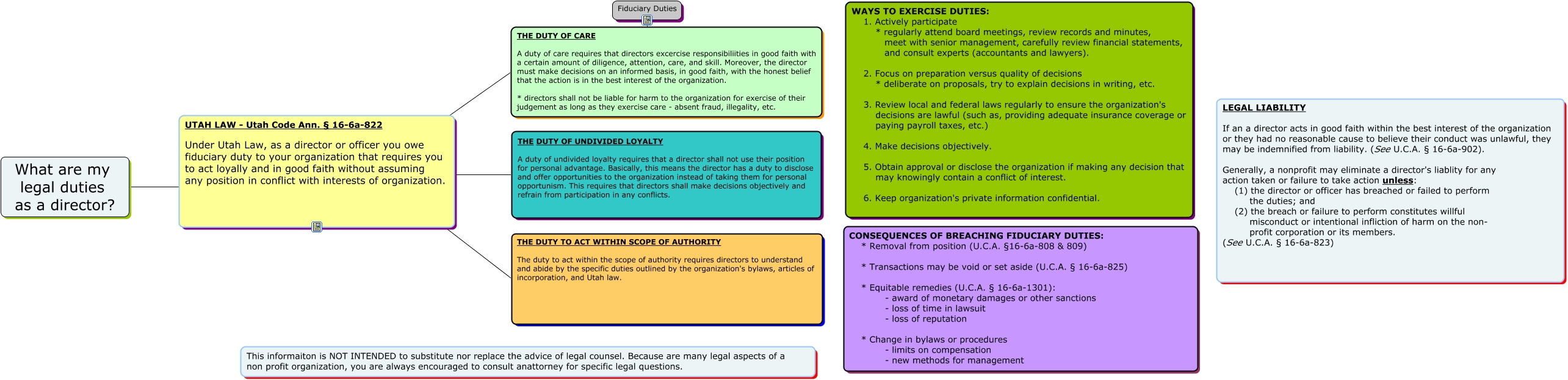 This Concept Map, created with IHMC CmapTools, has information related to: Major - Fiduciary Duties, THE DUTY OF CARE A duty of care requires that directors excercise responsibiliities in good faith with a certain amount of diligence, attention, care, and skill. Moreover, the director must make decisions on an informed basis, in good faith, with the honest belief that the action is in the best interest of the organization. * directors shall not be liable for harm to the organization for exercise of their judgement as long as they exercise care - absent fraud, illegality, etc. ???? Fiduciary Duties, UTAH LAW - Utah Code Ann. § 16-6a-822 Under Utah Law, as a director or officer you owe fiduciary duty to your organization that requires you to act loyally and in good faith without assuming any position in conflict with interests of organization. ???? THE DUTY OF CARE A duty of care requires that directors excercise responsibiliities in good faith with a certain amount of diligence, attention, care, and skill. Moreover, the director must make decisions on an informed basis, in good faith, with the honest belief that the action is in the best interest of the organization. * directors shall not be liable for harm to the organization for exercise of their judgement as long as they exercise care - absent fraud, illegality, etc., What are my legal duties as a director? ???? UTAH LAW - Utah Code Ann. § 16-6a-822 Under Utah Law, as a director or officer you owe fiduciary duty to your organization that requires you to act loyally and in good faith without assuming any position in conflict with interests of organization., UTAH LAW - Utah Code Ann. § 16-6a-822 Under Utah Law, as a director or officer you owe fiduciary duty to your organization that requires you to act loyally and in good faith without assuming any position in conflict with interests of organization. ???? THE DUTY OF UNDIVIDED LOYALTY A duty of undivided loyalty requires that a director shall not use their position for personal advantage. Basically, this means the director has a duty to disclose and offer opportunities to the organization instead of taking them for personal opportunism. This requires that directors shall make decisions objectively and refrain from participation in any conflicts., UTAH LAW - Utah Code Ann. § 16-6a-822 Under Utah Law, as a director or officer you owe fiduciary duty to your organization that requires you to act loyally and in good faith without assuming any position in conflict with interests of organization. ???? THE DUTY TO ACT WITHIN SCOPE OF AUTHORITY The duty to act within the scope of authority requires directors to understand and abide by the specific duties outlined by the organization's bylaws, articles of incorporation, and Utah law.