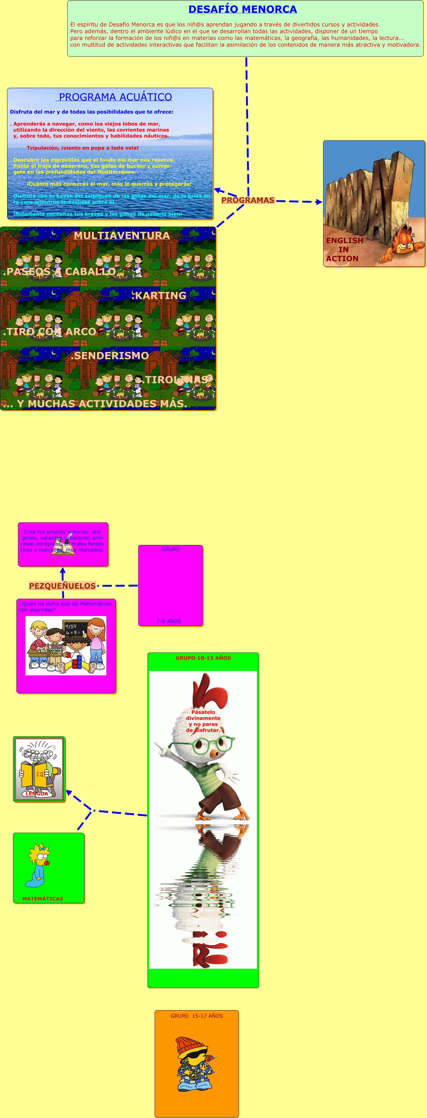 Este Cmap, tiene información relacionada con: Desafío Menorca, DESAFÍO MENORCA El espíritu de Desafío Menorca es que los niñ@s aprendan jugando a través de divertidos cursos y actividades. Pero además, dentro el ambiente lúdico en el que se desarrollan todas las actividades, disponer de un tiempo para reforzar la formación de los niñ@s en materias como las matemáticas, la geografía, las humanidades, la lectura... con multitud de actividades interactivas que facilitan la asimilación de los contenidos de manera más atractiva y motivadora. PROGRAMAS ENGLISH IN ACTION, GRUPO 7-9 AÑOS PEZQUEÑUELOS Crea tus propias historias: dra- gones, valientes caballeros, prin- cesas intrépidas, animales fantás- ticos y malvados, muy malvados., DESAFÍO MENORCA El espíritu de Desafío Menorca es que los niñ@s aprendan jugando a través de divertidos cursos y actividades. Pero además, dentro el ambiente lúdico en el que se desarrollan todas las actividades, disponer de un tiempo para reforzar la formación de los niñ@s en materias como las matemáticas, la geografía, las humanidades, la lectura... con multitud de actividades interactivas que facilitan la asimilación de los contenidos de manera más atractiva y motivadora. PROGRAMAS MULTIAVENTURA .PASEOS A CABALLO .KARTING .TIRO CON ARCO .SENDERISMO .TIROLINAS ... Y MUCHAS ACTIVIDADES MÁS., GRUPO 7-9 AÑOS PEZQUEÑUELOS ¿Quién ha dicho que las Matemáticas son aburridas?., GRUPO 10-13 AÑOS Pásatelo divinamente y no pares de disfrutar. MATEMÁTICAS, GRUPO 10-13 AÑOS Pásatelo divinamente y no pares de disfrutar. LENGUA, DESAFÍO MENORCA El espíritu de Desafío Menorca es que los niñ@s aprendan jugando a través de divertidos cursos y actividades. Pero además, dentro el ambiente lúdico en el que se desarrollan todas las actividades, disponer de un tiempo para reforzar la formación de los niñ@s en materias como las matemáticas, la geografía, las humanidades, la lectura... con multitud de actividades interactivas que facilitan la asimilación de los contenidos de manera más atractiva y motivadora. PROGRAMAS PROGRAMA ACUÁTICO Disfruta del mar y de todas las posibilidades que te ofrece: . Aprenderás a navegar, como los viejos lobos de mar, utilizando la dirección del viento, las corrientes marinas y, sobre todo, tus conocimientos y habilidades náuticos. Tripulación, ¡viento en popa a toda vela! . Descubre las maravillas que el fondo del mar nos reserva. Ponte el traje de neopreno, tus gafas de bucear y sumér- gete en las profundidades del Mediterráneo. ¡Cuánto más conozcas el mar, más lo querrás y protegerás! . Disfruta con tu kayak del salpiqueo de las gotas del mar, de la brisa en tu cara mientras te deslizas sobre él. ¡Solamente necesitas tus brazos y las ganas de pasarlo bien!