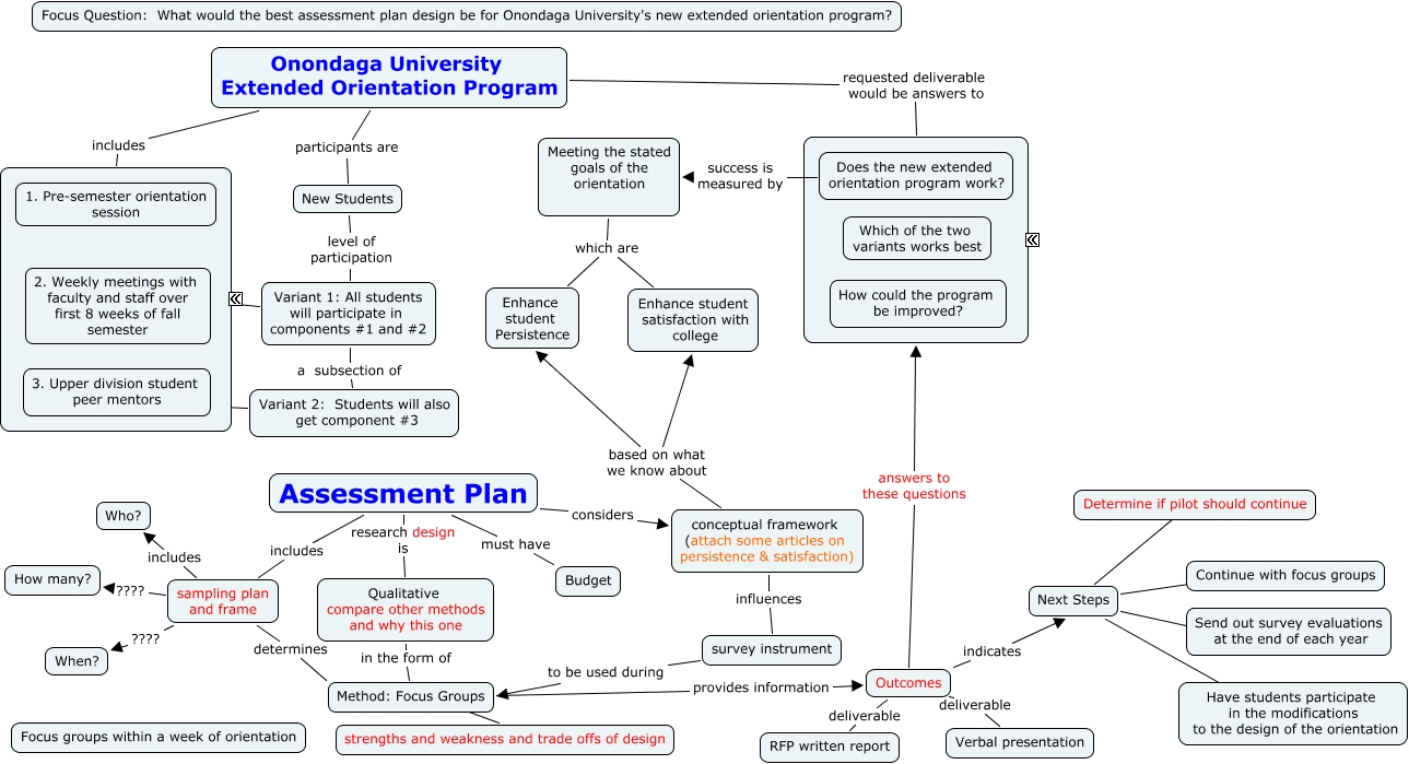 This Concept Map, created with IHMC CmapTools, has information related to: Extended Orientation Program, Method: Focus Groups provides information Outcomes, survey instrument to be used during Method: Focus Groups, Assessment Plan must have Budget, Next Steps ???? Determine if pilot should continue, Meeting the stated goals of the orientation which are Enhance student satisfaction with college, Variant 2: Students will also get component #3 ???? 3. Upper division student peer mentors, conceptual framework (attach some articles on persistence & satisfaction) based on what we know about Enhance student Persistence, Outcomes deliverable Verbal presentation, Assessment Plan considers conceptual framework (attach some articles on persistence & satisfaction), Outcomes answers to these questions Key questions, Outcomes indicates Next Steps, Outcomes deliverable RFP written report, Next Steps ???? Send out survey evaluations at the end of each year, sampling plan and frame includes Who?, Next Steps ???? Continue with focus groups, Meeting the stated goals of the orientation which are Enhance student Persistence, Assessment Plan research design is Qualitative compare other methods and why this one, Next Steps ???? Have students participate in the modifications to the design of the orientation, Variant 1: All students will participate in components #1 and #2 ???? Components of the Orientation, conceptual framework (attach some articles on persistence & satisfaction) influences survey instrument