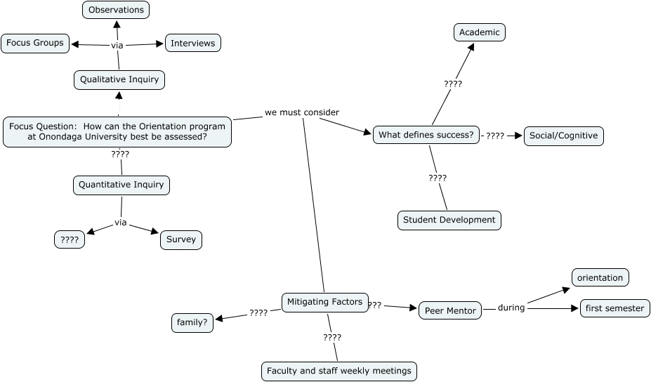 This Concept Map, created with IHMC CmapTools, has information related to: Orientation Assessment Proposal, Focus Question: How can the Orientation program at Onondaga University best be assessed? we must consider Mitigating Factors, Mitigating Factors ???? family?, What defines success? ???? Academic, Peer Mentor during orientation, What defines success? ???? Social/Cognitive, What defines success? ???? Student Development, Peer Mentor during first semester, Mitigating Factors ???? Peer Mentor, Focus Question: How can the Orientation program at Onondaga University best be assessed? we must consider What defines success?, Mitigating Factors ???? Faculty and staff weekly meetings, Qualitative Inquiry via Interviews, Qualitative Inquiry via Observations, Focus Question: How can the Orientation program at Onondaga University best be assessed? Qualitative Inquiry, Quantitative Inquiry via Survey, Focus Question: How can the Orientation program at Onondaga University best be assessed? ???? Quantitative Inquiry, Qualitative Inquiry via Focus Groups, Quantitative Inquiry via ????