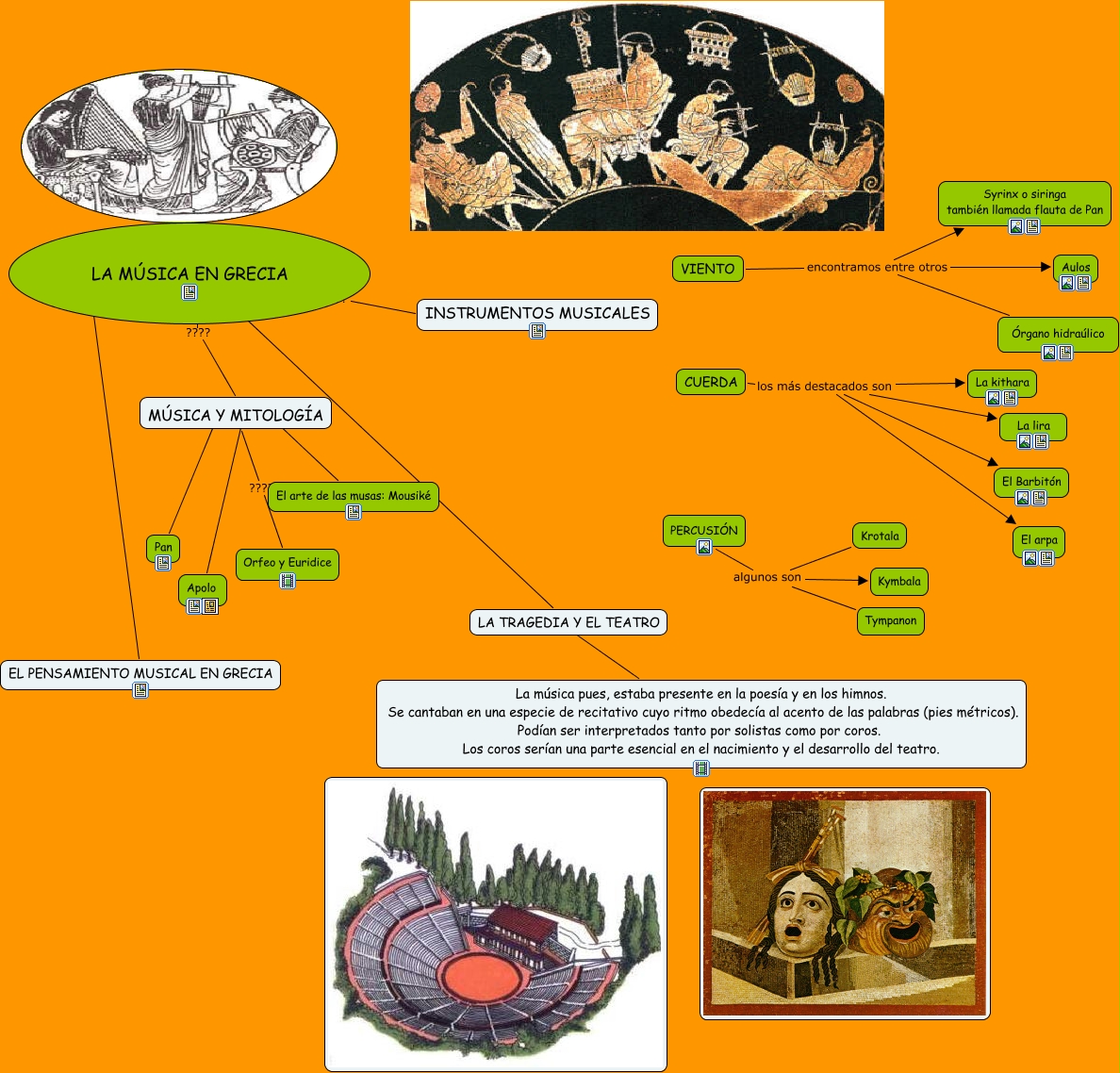 Este Cmap, tiene información relacionada con: LA MÚSICA EN GRECIA, VIENTO encontramos entre otros Aulos, MÚSICA Y MITOLOGÍA ???? Orfeo y Euridice, LA TRAGEDIA Y EL TEATRO ???? La música pues, estaba presente en la poesía y en los himnos. Se cantaban en una especie de recitativo cuyo ritmo obedecía al acento de las palabras (pies métricos). Podían ser interpretados tanto por solistas como por coros. Los coros serían una parte esencial en el nacimiento y el desarrollo del teatro., LA MÚSICA EN GRECIA ???? INSTRUMENTOS MUSICALES, PERCUSIÓN algunos son Krotala, CUERDA los más destacados son La lira, CUERDA los más destacados son El arpa, MÚSICA Y MITOLOGÍA ???? Apolo, VIENTO encontramos entre otros Órgano hidraúlico, LA MÚSICA EN GRECIA ???? LA TRAGEDIA Y EL TEATRO, VIENTO encontramos entre otros Syrinx o siringa también llamada flauta de Pan, PERCUSIÓN algunos son Kymbala, ???? ???? EL PENSAMIENTO MUSICAL EN GRECIA, MÚSICA Y MITOLOGÍA ???? El arte de las musas: Mousiké, CUERDA los más destacados son La kithara, CUERDA los más destacados son El Barbitón, LA MÚSICA EN GRECIA ???? MÚSICA Y MITOLOGÍA, PERCUSIÓN algunos son Tympanon, MÚSICA Y MITOLOGÍA ???? Pan