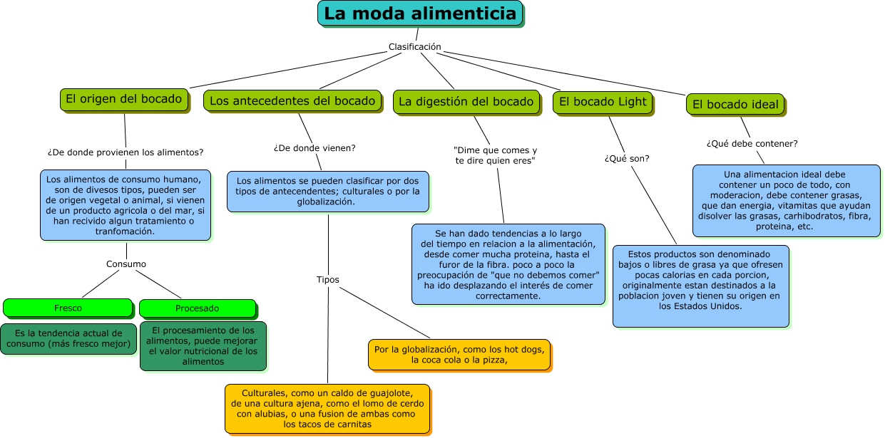 Este Cmap, tiene información relacionada con: Moda alimenticia, Los antecedentes del bocado ¿De donde vienen? Los alimentos se pueden clasificar por dos tipos de antecendentes; culturales o por la globalización., El bocado ideal ¿Qué debe contener? Una alimentacion ideal debe contener un poco de todo, con moderacion, debe contener grasas, que dan energia, vitamitas que ayudan disolver las grasas, carhibodratos, fibra, proteina, etc., La moda alimenticia Clasificación El bocado Light, El bocado Light ¿Qué son? Estos productos son denominado bajos o libres de grasa ya que ofresen pocas calorias en cada porcion, originalmente estan destinados a la poblacion joven y tienen su origen en los Estados Unidos., El origen del bocado ¿De donde provienen los alimentos? Los alimentos de consumo humano, son de divesos tipos, pueden ser de origen vegetal o animal, si vienen de un producto agricola o del mar, si han recivido algun tratamiento o tranfomación., La digestión del bocado "Dime que comes y te dire quien eres" Se han dado tendencias a lo largo del tiempo en relacion a la alimentación, desde comer mucha proteina, hasta el furor de la fibra. poco a poco la preocupación de "que no debemos comer" ha ido desplazando el interés de comer correctamente., Los alimentos de consumo humano, son de divesos tipos, pueden ser de origen vegetal o animal, si vienen de un producto agricola o del mar, si han recivido algun tratamiento o tranfomación. Consumo Procesado, La moda alimenticia Clasificación Los antecedentes del bocado, Los alimentos se pueden clasificar por dos tipos de antecendentes; culturales o por la globalización. Tipos Culturales, como un caldo de guajolote, de una cultura ajena, como el lomo de cerdo con alubias, o una fusion de ambas como los tacos de carnitas, La moda alimenticia Clasificación La digestión del bocado, Los alimentos se pueden clasificar por dos tipos de antecendentes; culturales o por la globalización. Tipos Por la globalización, como los hot dogs, la coca cola o la pizza,, La moda alimenticia Clasificación El bocado ideal, La moda alimenticia Clasificación El origen del bocado, Los alimentos de consumo humano, son de divesos tipos, pueden ser de origen vegetal o animal, si vienen de un producto agricola o del mar, si han recivido algun tratamiento o tranfomación. Consumo Fresco