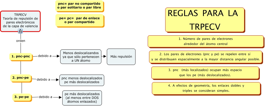 Este Cmap, tiene información relacionada con: TRPECV, TRPECV Teoría de repulsión de pares electrónicos de la capa de valencia orden 1. pnc-pnc, 1. pnc-pnc debido a Menos deslocalizandos ya que sólo pertenecen a UN átomo, 3. pe-pe debido a pe más deslocalizados (al menos entre DOS átomos enlazados), 2. pnc-pe ???? 3. pe-pe, TRPECV Teoría de repulsión de pares electrónicos de la capa de valencia orden 2. pnc-pe, 2. pnc-pe debido a pnc menos deslocalizados pe más deslocalizados, Menos deslocalizandos ya que sólo pertenecen a UN átomo ???? Más repulsión