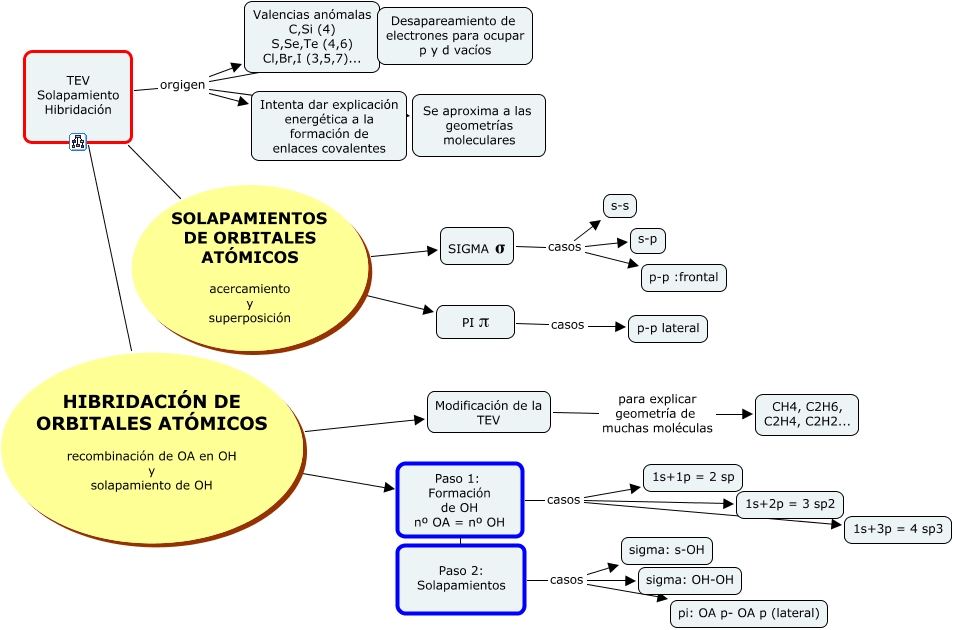 Este Cmap, tiene información relacionada con: TEV-hibridación, TEV Solapamiento Hibridación HIBRIDACIÓN DE ORBITALES ATÓMICOS recombinación de OA en OH y solapamiento de OH Paso 1: Formación de OH nº OA = nº OH, Paso 1: Formación de OH nº OA = nº OH ???? Paso 2: Solapamientos, TEV Solapamiento Hibridación SOLAPAMIENTOS DE ORBITALES ATÓMICOS acercamiento y superposición PI π, Paso 2: Solapamientos casos sigma: OH-OH, PI π casos p-p lateral, Paso 1: Formación de OH nº OA = nº OH casos 1s+1p = 2 sp, Paso 2: Solapamientos casos pi: OA p- OA p (lateral), TEV Solapamiento Hibridación orgigen Desapareamiento de electrones para ocupar p y d vacíos, Paso 1: Formación de OH nº OA = nº OH casos 1s+2p = 3 sp2, TEV Solapamiento Hibridación orgigen Se aproxima a las geometrías moleculares, TEV Solapamiento Hibridación orgigen Intenta dar explicación energética a la formación de enlaces covalentes, Paso 2: Solapamientos casos sigma: s-OH, TEV Solapamiento Hibridación orgigen Valencias anómalas C,Si (4) S,Se,Te (4,6) Cl,Br,I (3,5,7)..., TEV Solapamiento Hibridación HIBRIDACIÓN DE ORBITALES ATÓMICOS recombinación de OA en OH y solapamiento de OH Modificación de la TEV, Modificación de la TEV para explicar geometría de muchas moléculas CH4, C2H6, C2H4, C2H2..., TEV Solapamiento Hibridación SOLAPAMIENTOS DE ORBITALES ATÓMICOS acercamiento y superposición SIGMA σ, SIGMA σ casos s-p, Paso 1: Formación de OH nº OA = nº OH casos 1s+3p = 4 sp3, SIGMA σ casos s-s, SIGMA σ casos p-p :frontal