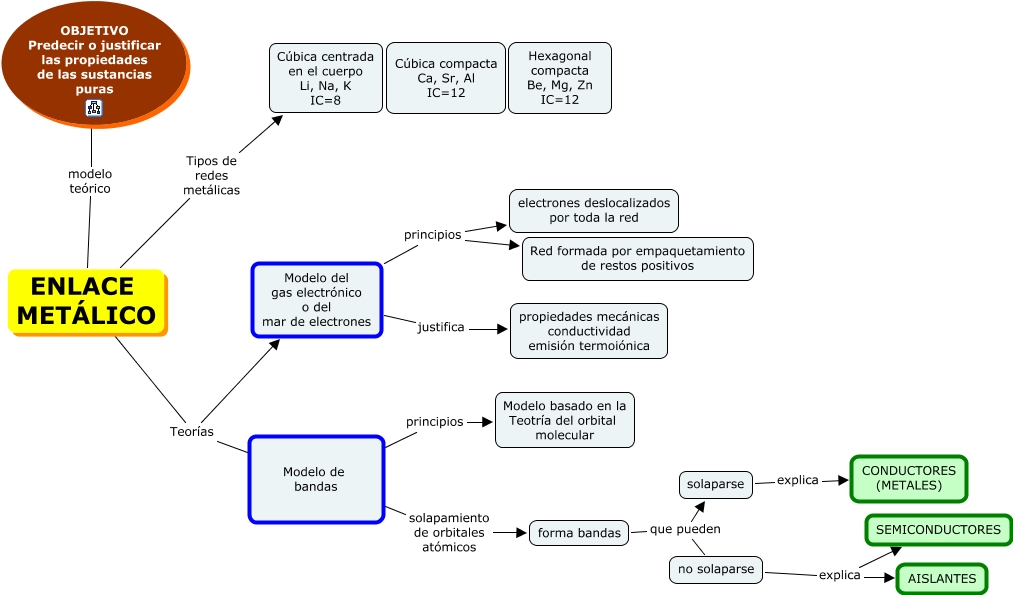 Este Cmap, tiene información relacionada con: enlace metálico, no solaparse explica SEMICONDUCTORES, ENLACE METÁLICO Teorías Modelo del gas electrónico o del mar de electrones, Modelo del gas electrónico o del mar de electrones principios Red formada por empaquetamiento de restos positivos, Modelo de bandas principios Modelo basado en la Teotría del orbital molecular, Modelo de bandas solapamiento de orbitales atómicos forma bandas, Modelo del gas electrónico o del mar de electrones justifica propiedades mecánicas conductividad emisión termoiónica, ENLACE METÁLICO Tipos de redes metálicas Cúbica centrada en el cuerpo Li, Na, K IC=8, solaparse explica CONDUCTORES (METALES), no solaparse explica AISLANTES, forma bandas que pueden no solaparse, forma bandas que pueden solaparse, ENLACE METÁLICO Teorías Modelo de bandas, OBJETIVO Predecir o justificar las propiedades de las sustancias puras modelo teórico ENLACE METÁLICO, Modelo del gas electrónico o del mar de electrones principios electrones deslocalizados por toda la red