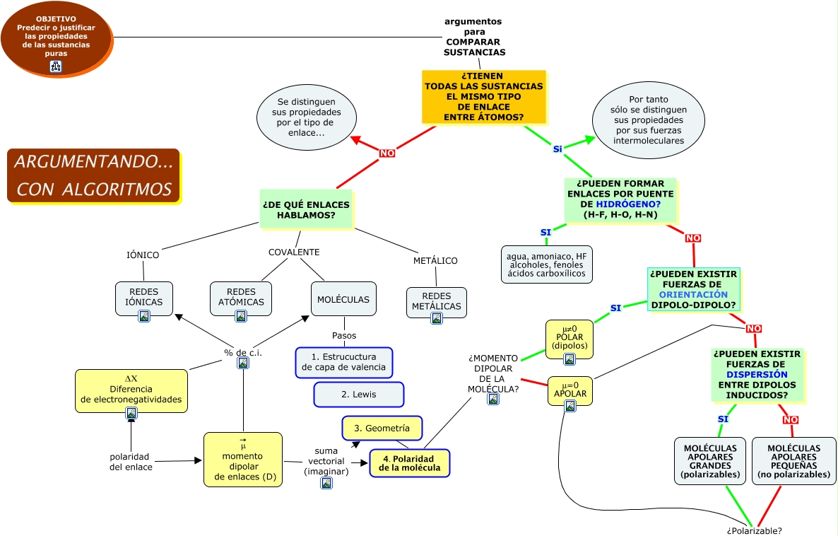 de enlaces (D) </mtext> </mrow> <mtext> → </mtext> </munderover> </mrow> </math> suma vectorial (imaginar) 3. Geometría, ΔΧ Diferencia de electronegatividades % de c.i. REDES IÓNICAS, 4. Polaridad de la molécula ¿MOMENTO DIPOLAR DE LA MOLÉCULA? μ≠0 POLAR (dipolos), MOLÉCULAS Pasos 4. Polaridad de la molécula, OBJETIVO Predecir o justificar las propiedades de las sustancias puras argumentos para COMPARAR SUSTANCIAS ¿TIENEN TODAS LAS SUSTANCIAS EL MISMO TIPO DE ENLACE ENTRE ÁTOMOS?, μ=0 APOLAR NO ¿PUEDEN EXISTIR FUERZAS DE DISPERSIÓN ENTRE DIPOLOS INDUCIDOS?, μ=0 APOLAR ¿Polarizable? MOLÉCULAS APOLARES PEQUEÑAS (no polarizables), ¿TIENEN TODAS LAS SUSTANCIAS EL MISMO TIPO DE ENLACE ENTRE ÁTOMOS? NO Se distinguen sus propiedades por el tipo de enlace..., MOLÉCULAS Pasos 1. Estrucuctura de capa de valencia, μ=0 APOLAR ¿MOMENTO DIPOLAR DE LA MOLÉCULA? μ≠0 POLAR (dipolos), ¿TIENEN TODAS LAS SUSTANCIAS EL MISMO TIPO DE ENLACE ENTRE ÁTOMOS? Si Por tanto sólo se distinguen sus propiedades por sus fuerzas intermoleculares, 4. Polaridad de la molécula ¿MOMENTO DIPOLAR DE LA MOLÉCULA? μ≠0 POLAR (dipolos), ¿PUEDEN FORMAR ENLACES POR PUENTE DE HIDRÓGENO? (H-F, H-O, H-N) NO ¿PUEDEN EXISTIR FUERZAS DE ORIENTACIÓN DIPOLO-DIPOLO?