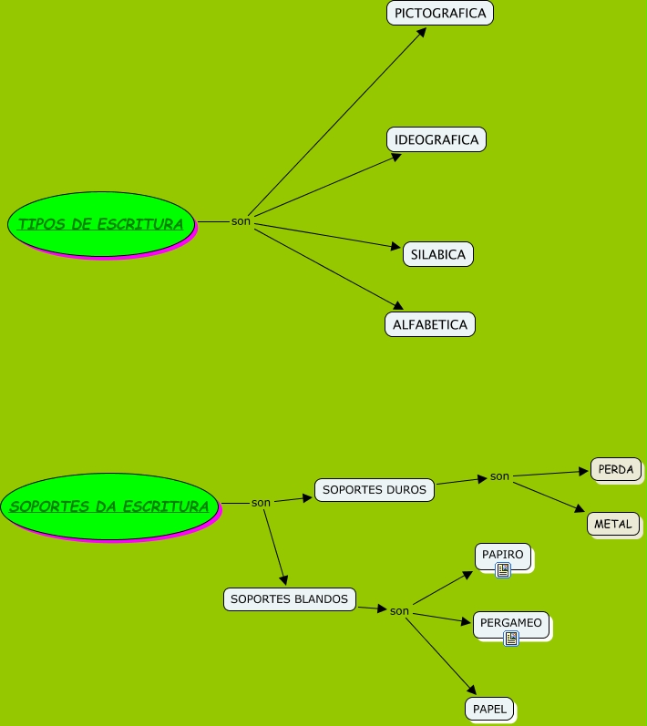 Este mapa conceptual ten información relativa a: Proba_01Brais, SOPORTES DUROS son METAL, SOPORTES BLANDOS son PERGAMEO, SOPORTES DUROS son PERDA, TIPOS DE ESCRITURA son ALFABETICA, SOPORTES BLANDOS son PAPIRO, SOPORTES DA ESCRITURA son SOPORTES BLANDOS, SOPORTES DA ESCRITURA son SOPORTES DUROS, TIPOS DE ESCRITURA son SILABICA, TIPOS DE ESCRITURA son PICTOGRAFICA, SOPORTES BLANDOS son PAPEL, TIPOS DE ESCRITURA son IDEOGRAFICA