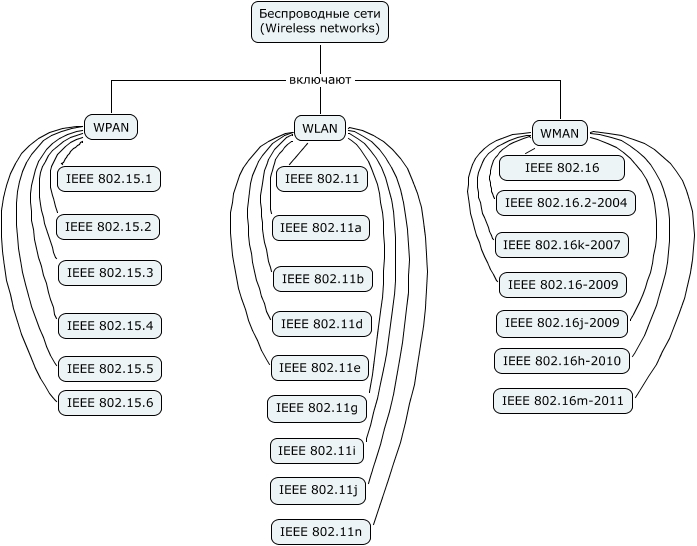 This Concept Map, created with IHMC CmapTools, has information related to: Wireless networks, WPAN IEEE 802.15.4, WLAN IEEE 802.11n, WMAN IEEE 802.16, WLAN IEEE 802.11i, WMAN IEEE 802.16m-2011, Беспроводные сети (Wireless networks) включают WLAN, WMAN IEEE 802.16-2009, Беспроводные сети (Wireless networks) включают WPAN, WPAN IEEE 802.15.3, WPAN IEEE 802.15.1, WLAN IEEE 802.11a, WLAN IEEE 802.11, WPAN IEEE 802.15.5, WLAN IEEE 802.11d, WPAN IEEE 802.15.2, WLAN IEEE 802.11b, WMAN IEEE 802.16h-2010, WMAN IEEE 802.16k-2007, WLAN IEEE 802.11g, WMAN IEEE 802.16.2-2004
