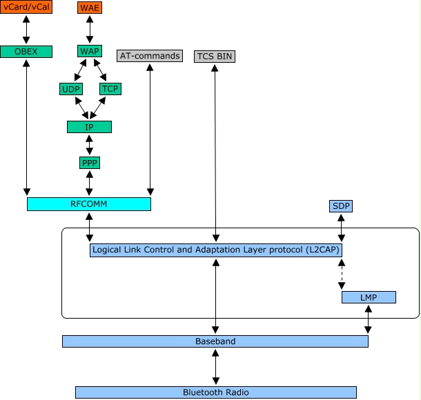 This Concept Map, created with IHMC CmapTools, has information related to: Bluetooth Stack, WAP UDP, WAE WAP, Logical Link Control and Adaptation Layer protocol (L2CAP) Baseband, AT-commands RFCOMM, UDP IP, TCS BIN Logical Link Control and Adaptation Layer protocol (L2CAP), IP PPP, Baseband Bluetooth Radio, TCP IP, OBEX RFCOMM, LMP Logical Link Control and Adaptation Layer protocol (L2CAP), PPP RFCOMM, RFCOMM Logical Link Control and Adaptation Layer protocol (L2CAP), SDP Logical Link Control and Adaptation Layer protocol (L2CAP), WAP TCP, LMP Baseband, vCard/vCal OBEX