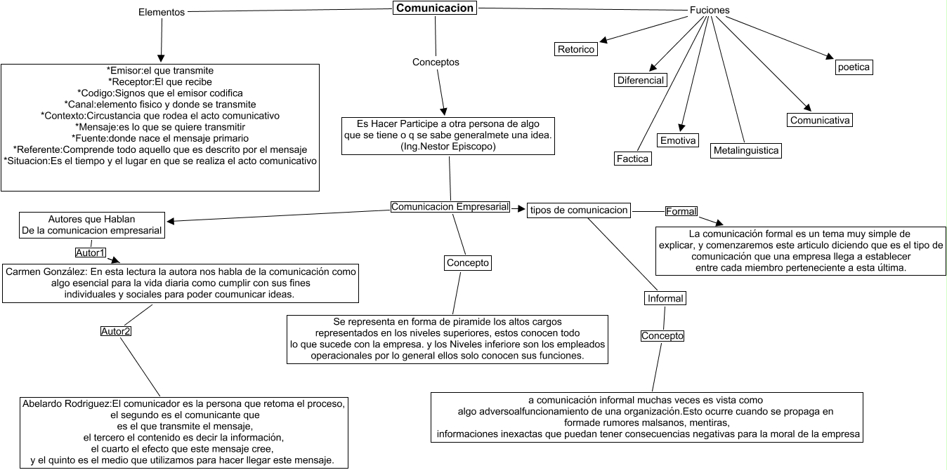 Este Cmap, tiene información relacionada con: juan david perez, Carmen González: En esta lectura la autora nos habla de la comunicación como algo esencial para la vida diaria como cumplir con sus fines individuales y sociales para poder coumunicar ideas. Autor2 Abelardo Rodriguez:El comunicador es la persona que retoma el proceso, el segundo es el comunicante que es el que transmite el mensaje, el tercero el contenido es decir la información, el cuarto el efecto que este mensaje cree, y el quinto es el medio que utilizamos para hacer llegar este mensaje., Comunicacion Fuciones Metalinguistica, Comunicacion Conceptos Es Hacer Participe a otra persona de algo que se tiene o q se sabe generalmete una idea. (Ing.Nestor Episcopo), Es Hacer Participe a otra persona de algo que se tiene o q se sabe generalmete una idea. (Ing.Nestor Episcopo) Comunicacion Empresarial Concepto, Comunicacion Fuciones Retorico, Comunicacion Fuciones Emotiva, tipos de comunicacion Formal La comunicación formal es un tema muy simple de explicar, y comenzaremos este articulo diciendo que es el tipo de comunicación que una empresa llega a establecer entre cada miembro perteneciente a esta última., Comunicacion Fuciones Factica, Es Hacer Participe a otra persona de algo que se tiene o q se sabe generalmete una idea. (Ing.Nestor Episcopo) Comunicacion Empresarial Autores que Hablan De la comunicacion empresarial, Es Hacer Participe a otra persona de algo que se tiene o q se sabe generalmete una idea. (Ing.Nestor Episcopo) Comunicacion Empresarial tipos de comunicacion, Informal Concepto a comunicación informal muchas veces es vista como algo adversoalfuncionamiento de una organización.Esto ocurre cuando se propaga en formade rumores malsanos, mentiras, informaciones inexactas que puedan tener consecuencias negativas para la moral de la empresa, tipos de comunicacion ???? Informal, Concepto ???? Se representa en forma de piramide los altos cargos representados en los niveles superiores, estos conocen todo lo que sucede con la empresa. y los Niveles inferiore son los empleados operacionales por lo general ellos solo conocen sus funciones., Comunicacion Fuciones Comunicativa, Comunicacion Fuciones poetica, Autores que Hablan De la comunicacion empresarial Autor1 Carmen González: En esta lectura la autora nos habla de la comunicación como algo esencial para la vida diaria como cumplir con sus fines individuales y sociales para poder coumunicar ideas., Comunicacion Elementos *Emisor:el que transmite *Receptor:El que recibe *Codigo:Signos que el emisor codifica *Canal:elemento fisico y donde se transmite *Contexto:Circustancia que rodea el acto comunicativo *Mensaje:es lo que se quiere transmitir *Fuente:donde nace el mensaje primario *Referente:Comprende todo aquello que es descrito por el mensaje *Situacion:Es el tiempo y el lugar en que se realiza el acto comunicativo, Comunicacion Fuciones Diferencial