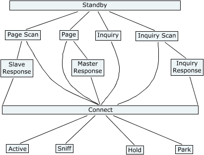 This Concept Map, created with IHMC CmapTools, has information related to: Bluetooth Connections, Page Connect, Connect Park, Standby Inquiry Scan, Page Scan Slave Response, Connect Active, Standby Inquiry, Inquiry Scan Connect, Page Master Response, Standby Page, Master Response Connect, Inquiry Connect, Page Scan Connect, Slave Response Connect, Connect Sniff, Inquiry Response Connect, Inquiry Scan Inquiry Response, Standby Page Scan, Connect Hold