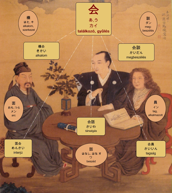 This Concept Map, created with IHMC CmapTools, has information related to: 20121122 FH, 会 あ,う カイ találkozó, gyűlés 機会 きかい alkalom, 会 あ,う カイ találkozó, gyűlés 会話 かいわ társalgás, 会 あ,う カイ találkozó, gyűlés 会談 かいだん megbeszélés, 会 あ,う カイ találkozó, gyűlés 面会 めんかい interjú, 会 あ,う カイ találkozó, gyűlés 会員 かいいん tagság